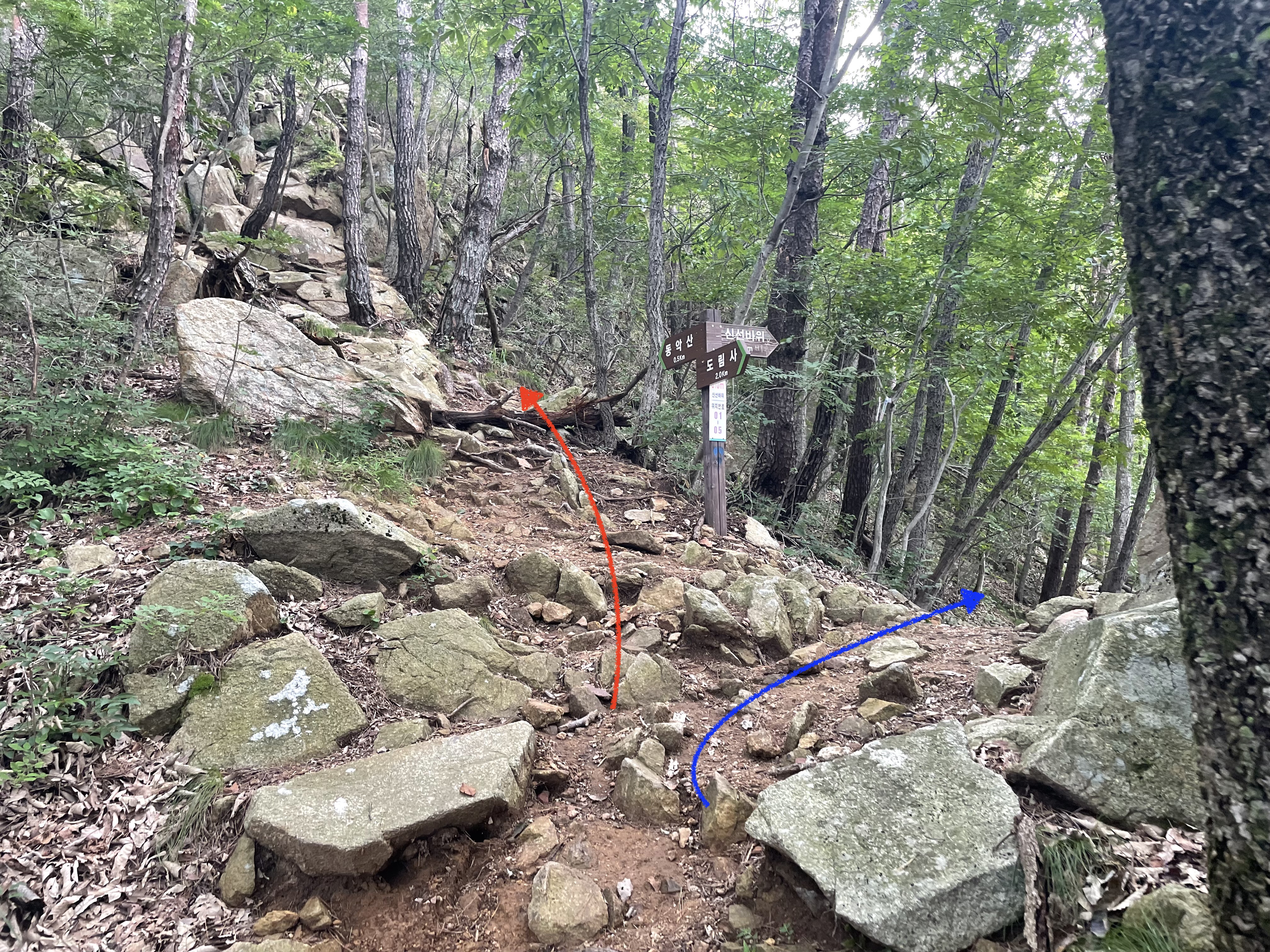 (파란색 화살표의 경우 )동악산 정상을 찍고