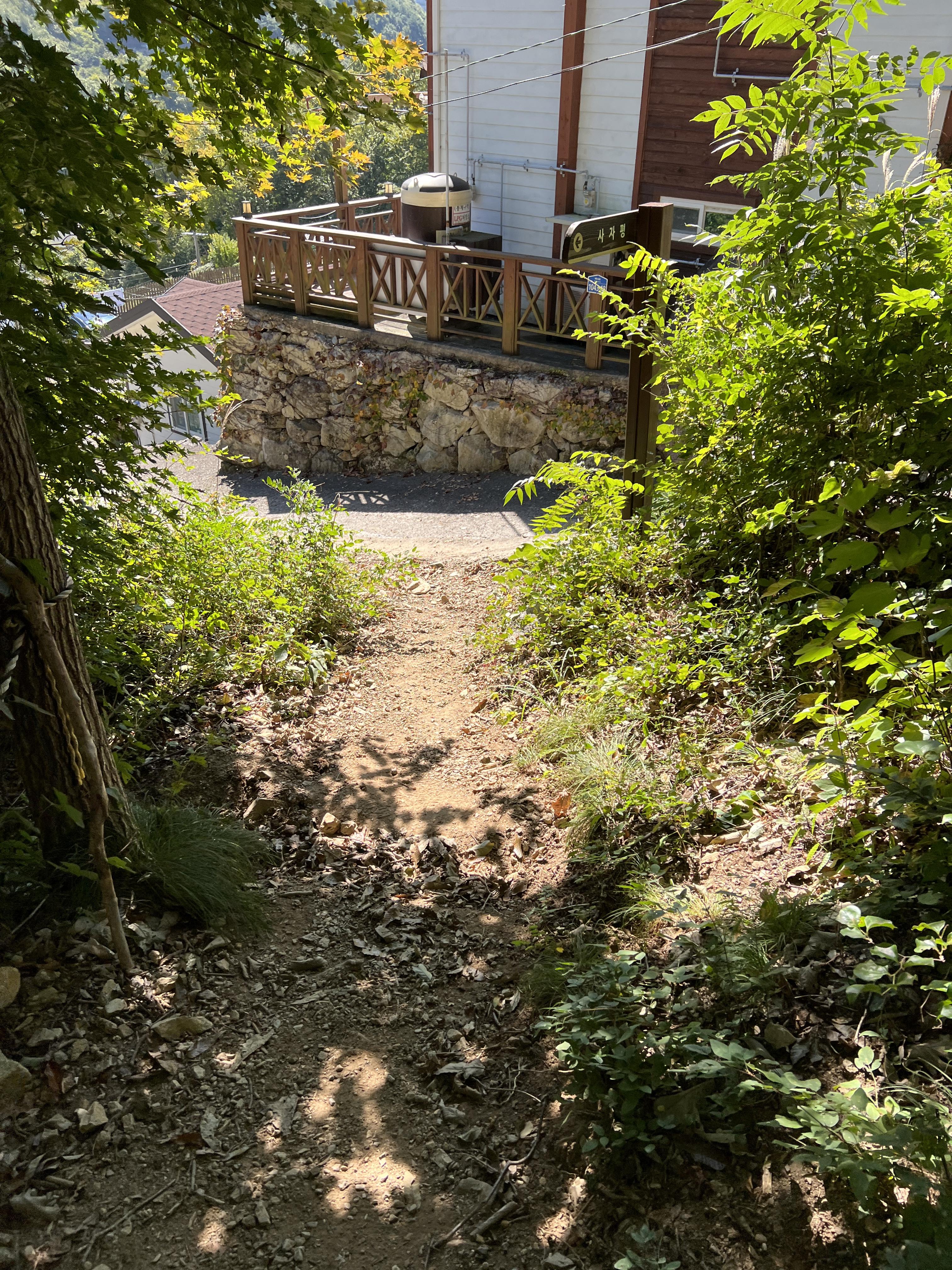 🔺하산을 하다보면, 어느 순간 가장 우측 사진처럼 집이 하나 보이는데, 이곳이 죽전마을이며 하산이 끝났음을 알립니다.