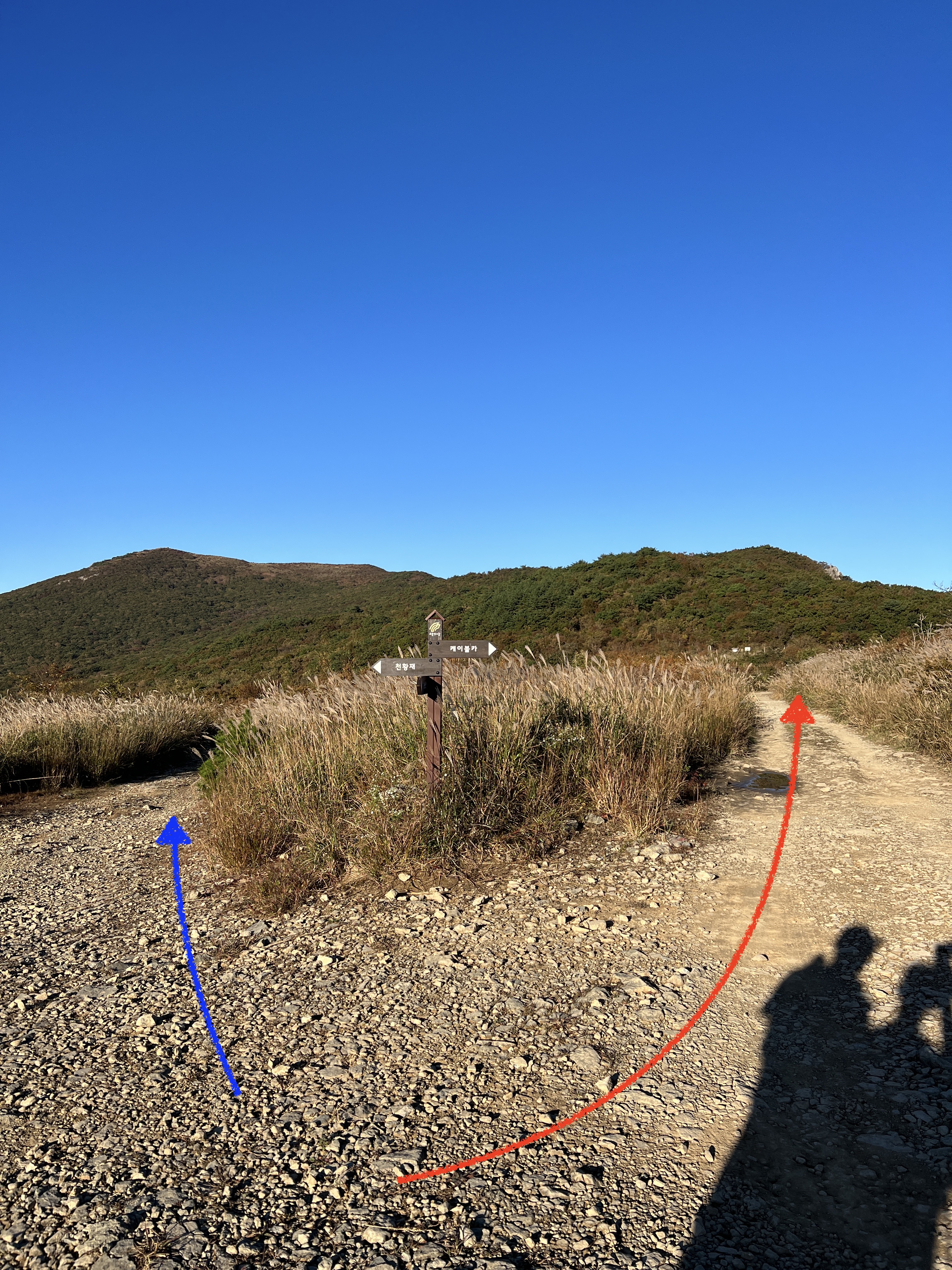 🔺위 사진에서 빨간색 화살표가 영축산으로 가는 길이며, 파란색 화살표가 화장실과 첫번쨰 보급지인 매점이 있는 곳입니다. 이곳에서 잠시 점심을 먹기로 하고 일행을 기다리며 다음 산행을 준비합니다.