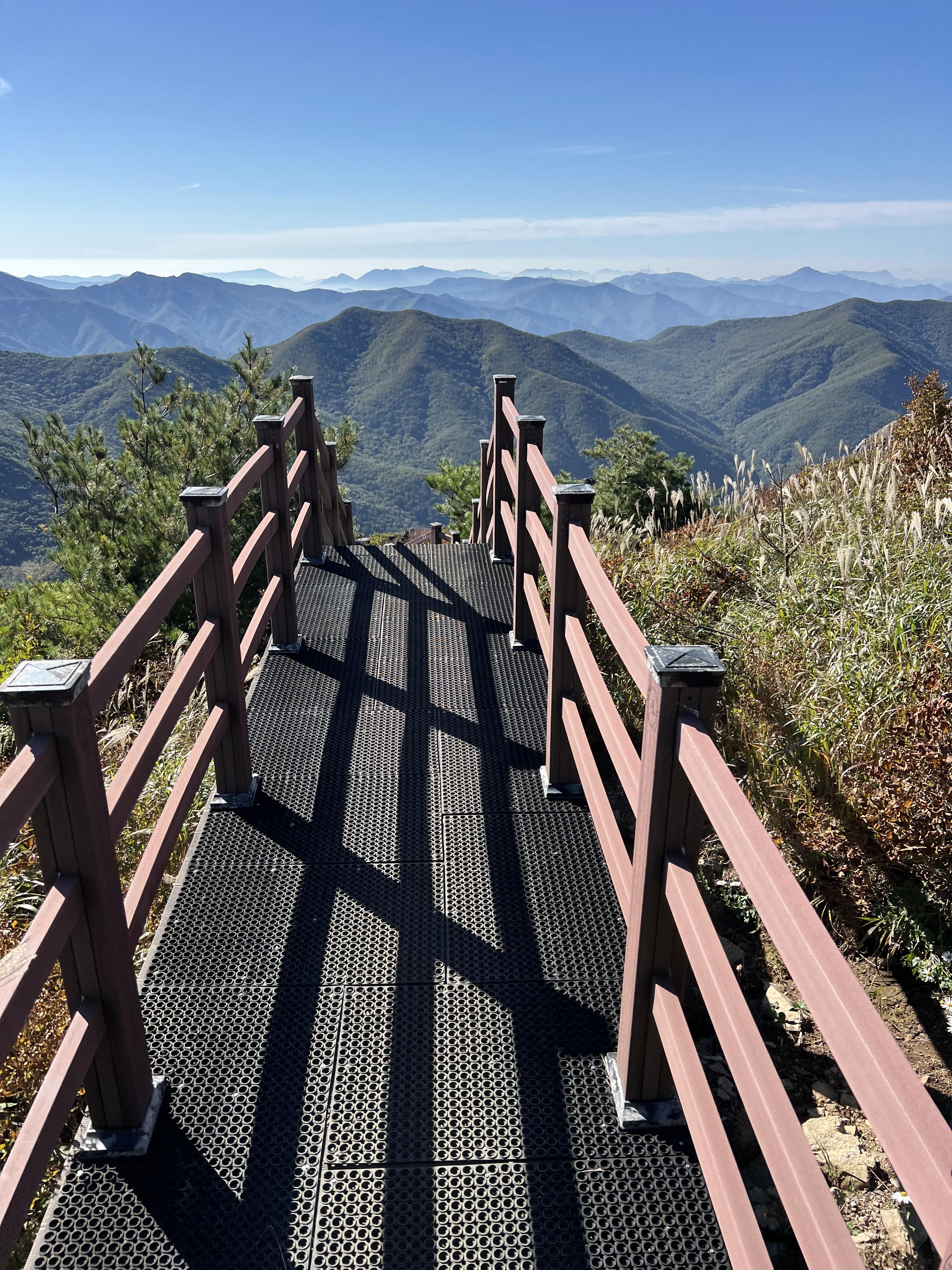 🔺어느정도 편안한 길을 빠르게 통과하다보면, 어느순간 하늘이 뚫리면서 뷰가 보이기 시작합니다. 그리고 억새들이 조금씩 보이면서 이제야 영남알프스에 온것을 느끼게 됩니다. 가장 좌측사진에서 높은 봉우리가 우리가 가야할 천황산입니다.