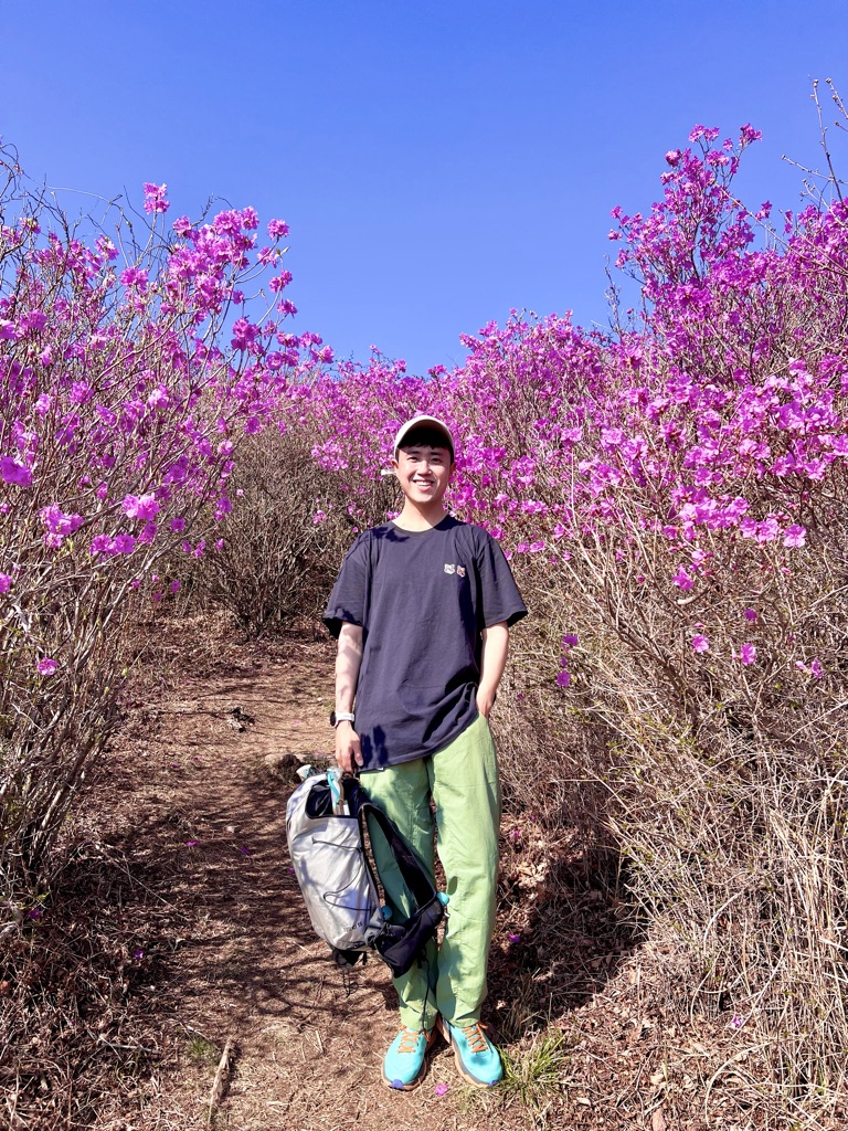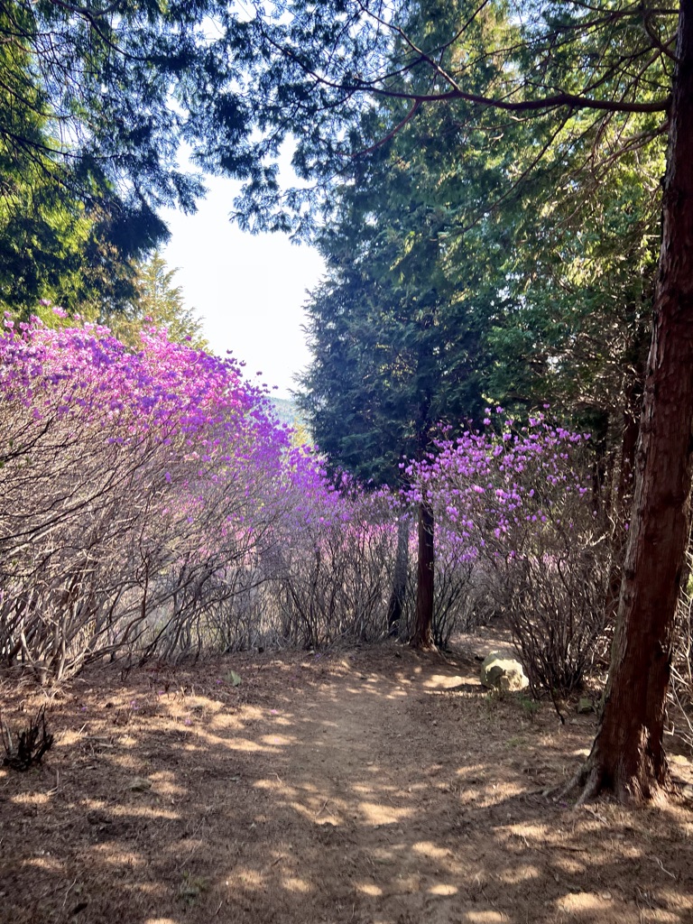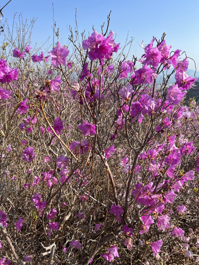 🔺벚꽃과 진달래가 함께 있는 곳도 있으며 사람 키보다 높은 진달래가 멋진 터널을 만들어주는 구간도 있습니다. 모든 산이 그러하겠지만 일출과 일몰의 빛이 드는 시점이 가장 이쁜데, 진달래와 설산 역시 빛이 들어야 정말 이쁜 사진을 건질 수 있습니다.오히려 빛이 쨍한 오후에는 별로고, 이른 아침이나 일몰시간에 가시는 것을 추천드립니다.