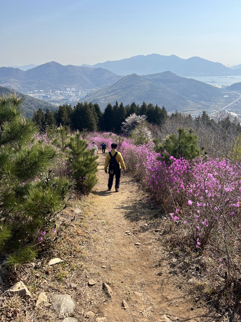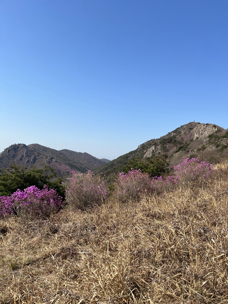해당 뷰 포인트 말고도 오르내리는 산 봉우리를 병풍삼아 뒷 배경으로, 알록달록한 진달래를 만끽하며 여러가지 뷰 포인트들이 꽤 많이 존재합니다. 특히 절정의 기간에는 저런 능선에 진달래 반, 사람 반일만큼 인기가 많은 산이므로 평일이나, 절정시기 앞뒤로 눈치를 잘 보며 산행 계획을 잡으시는 것을 추천드립니다.
