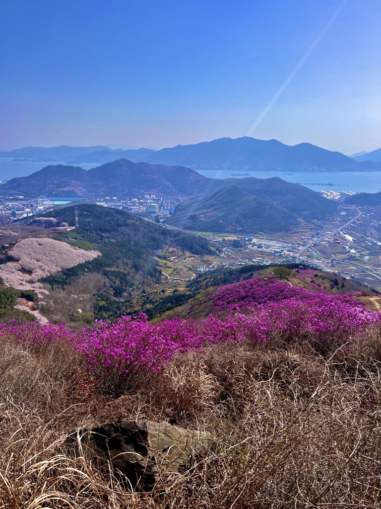 어느정도 오르다보면, 진달래 능선과 벚꽃이 모여있는 군락지를 한눈에 볼 수 있는 뷰 포인트에 도착하게 됩니다. 하지만 위 뷰포인트 말고도 전망대나 더 높은 곳에서 감상 할 수 있는 곳이 꽤 많습니다. 특히 이곳은 진달래와 벚꽃 군락지뿐 아니라 바다와 그 바다위에 자리 잡고 있는 크고 작은 섬을 한눈에 볼 수 있다는 것도 영취산만의 한 특징 입니다.