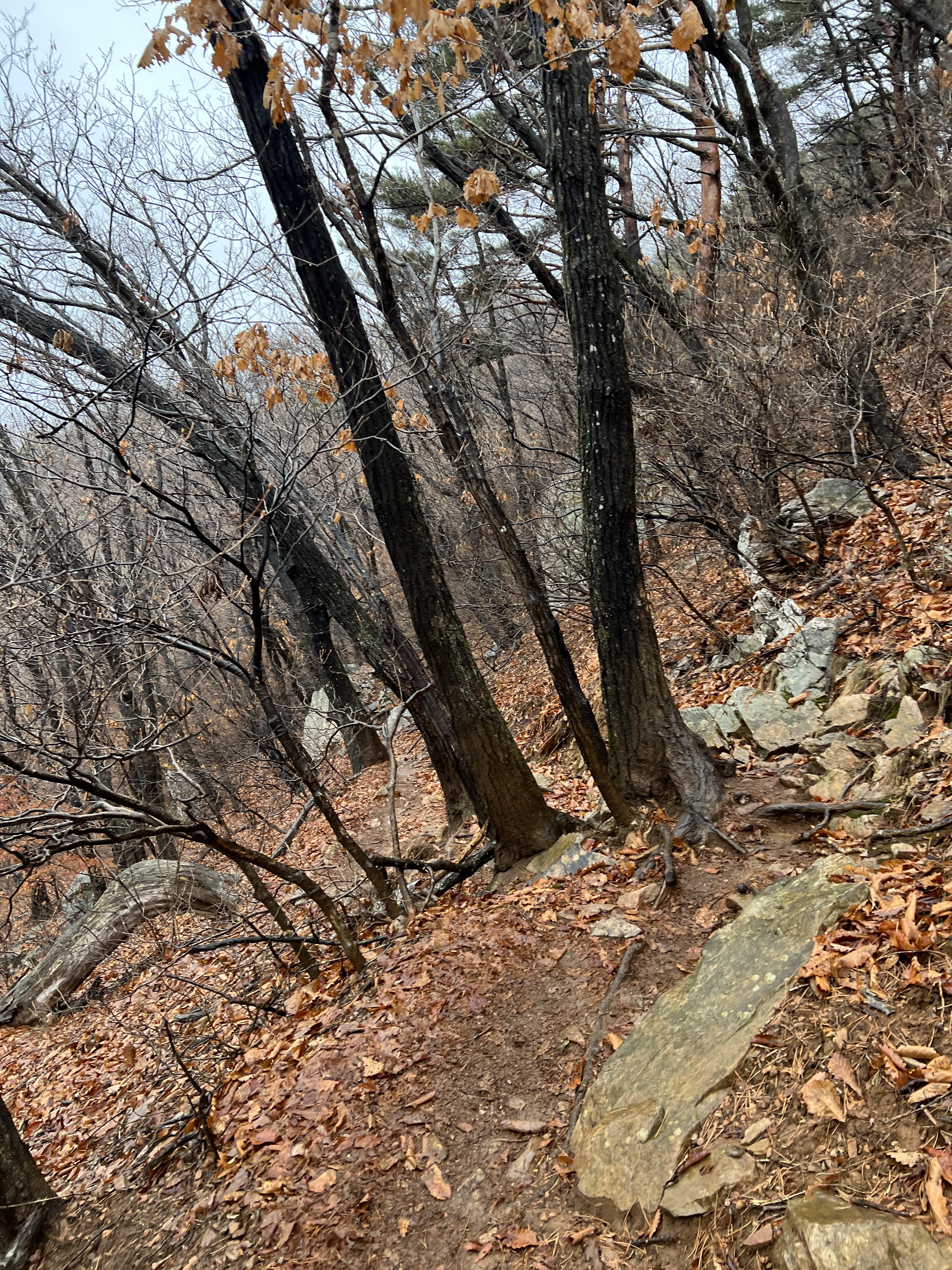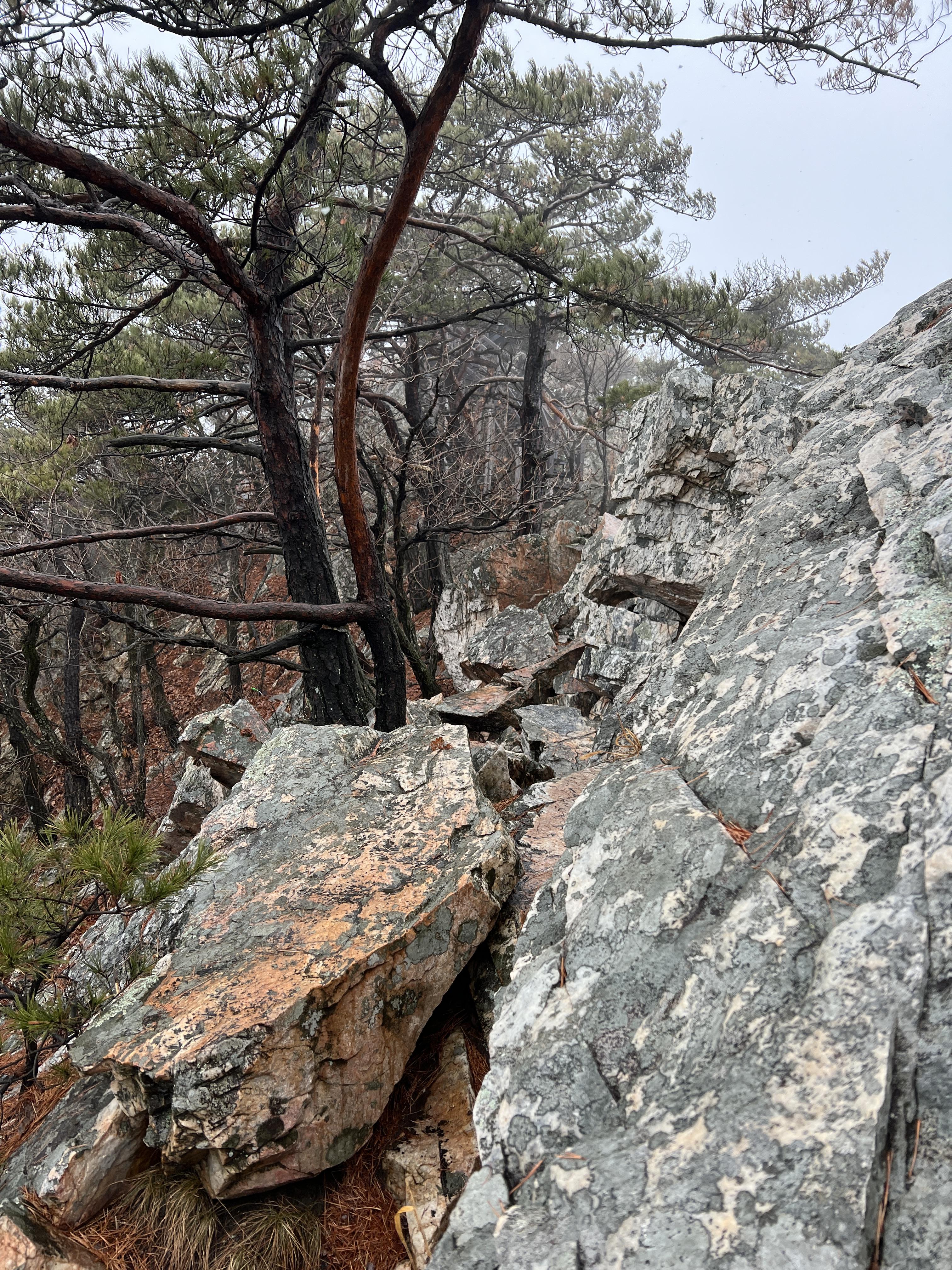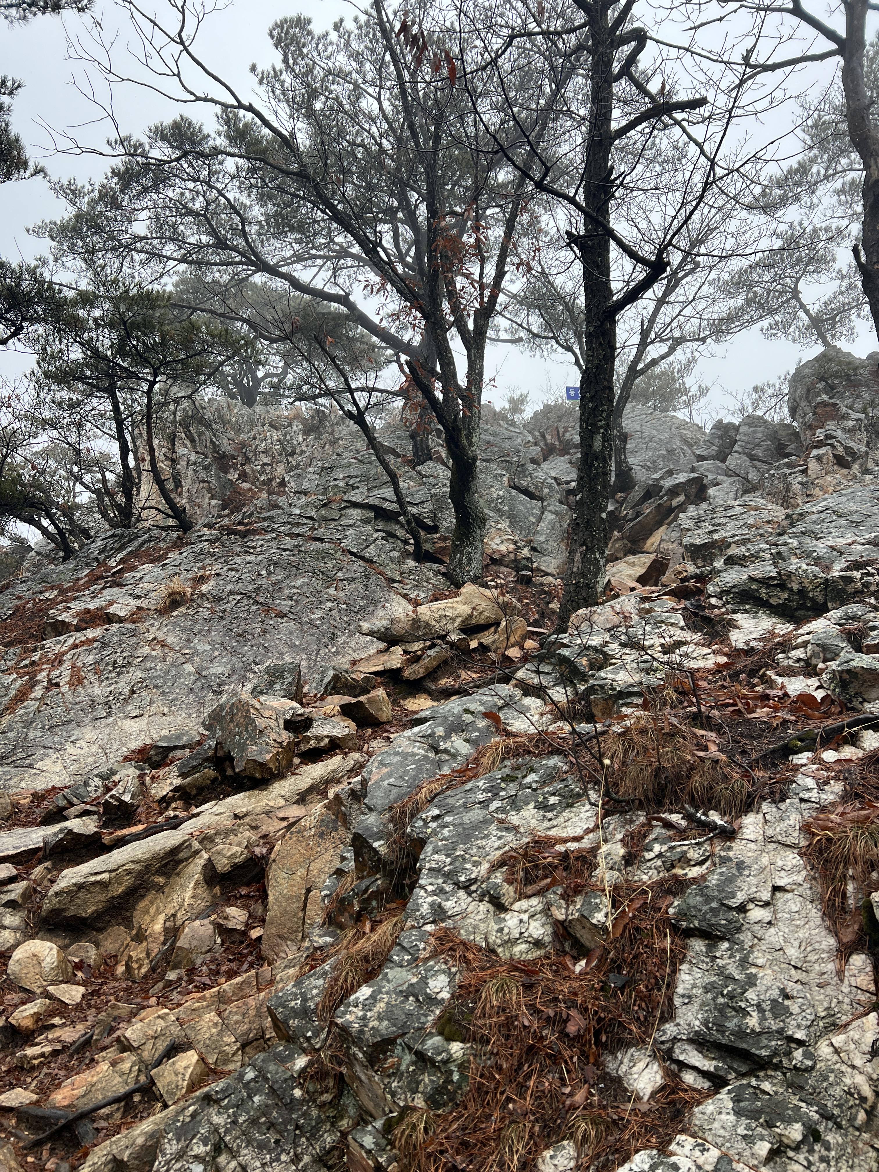 🔺계속해서 암릉 구간이 나오며 위로 진행할 수록 멋진 뷰가 펼쳐집니다. 아쉽게도 제가 등산한 날에는 비가 내리다가 눈으로 바뀌어서 날이 좀 흐렸습니다. 봄과 가을에 방문하면 전반적으로 산이 습해서 운해를 자주 목격할 수 있는 산이기도 합니다.