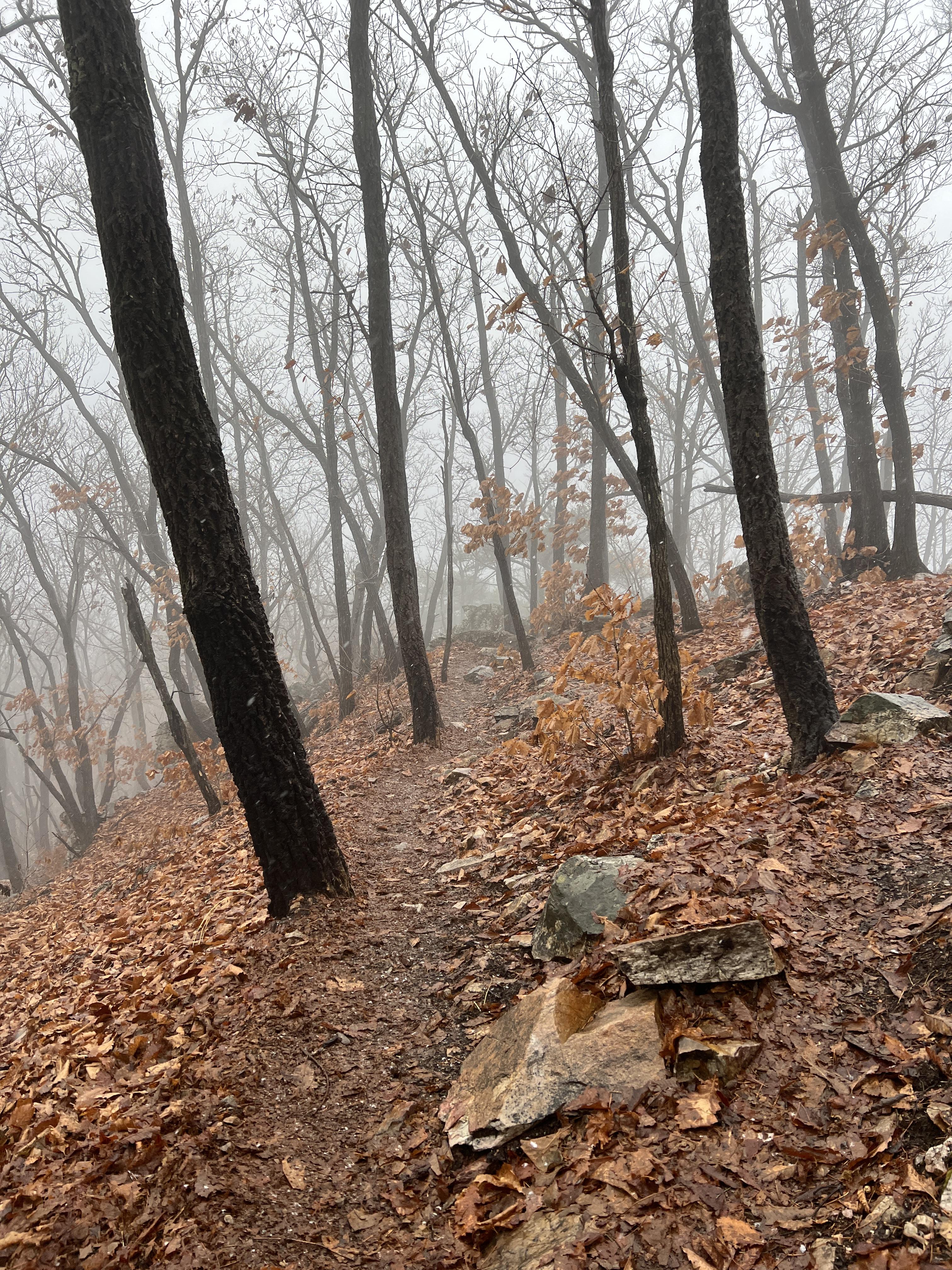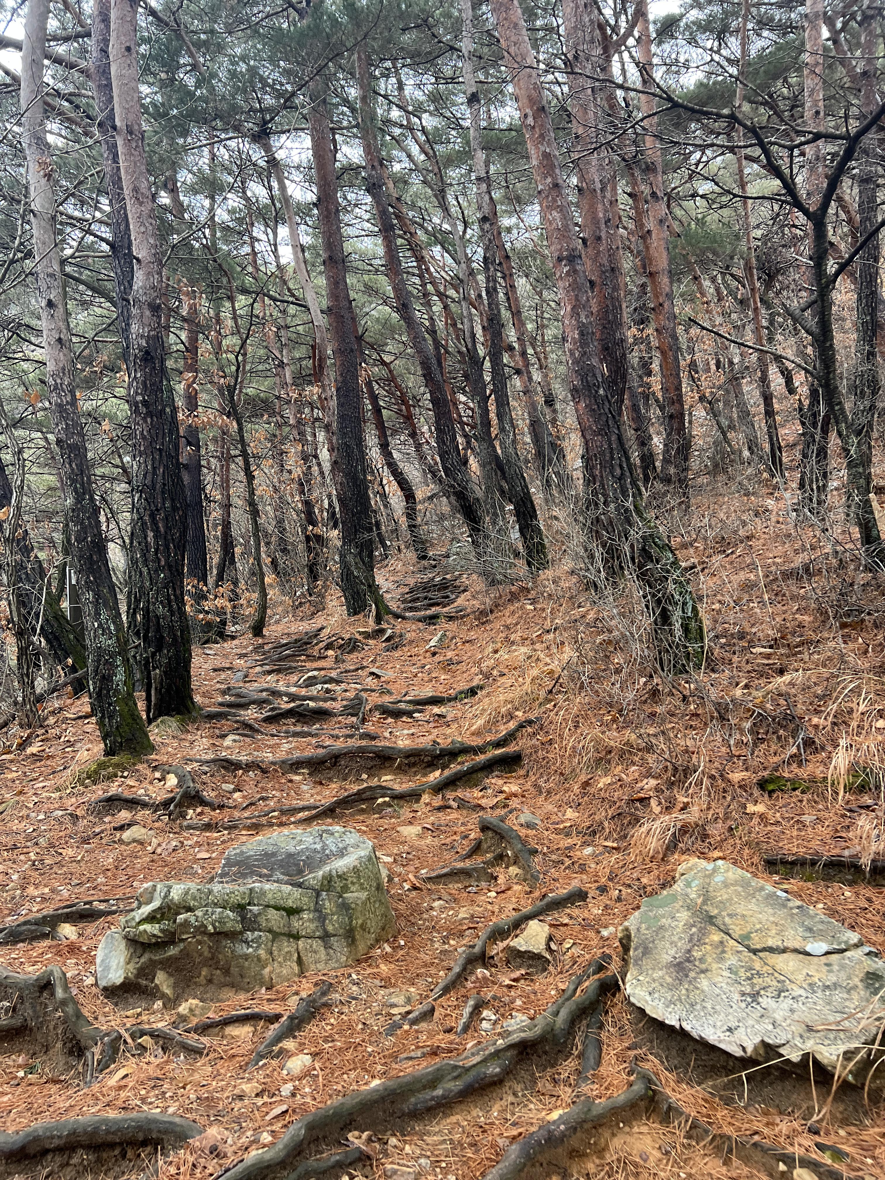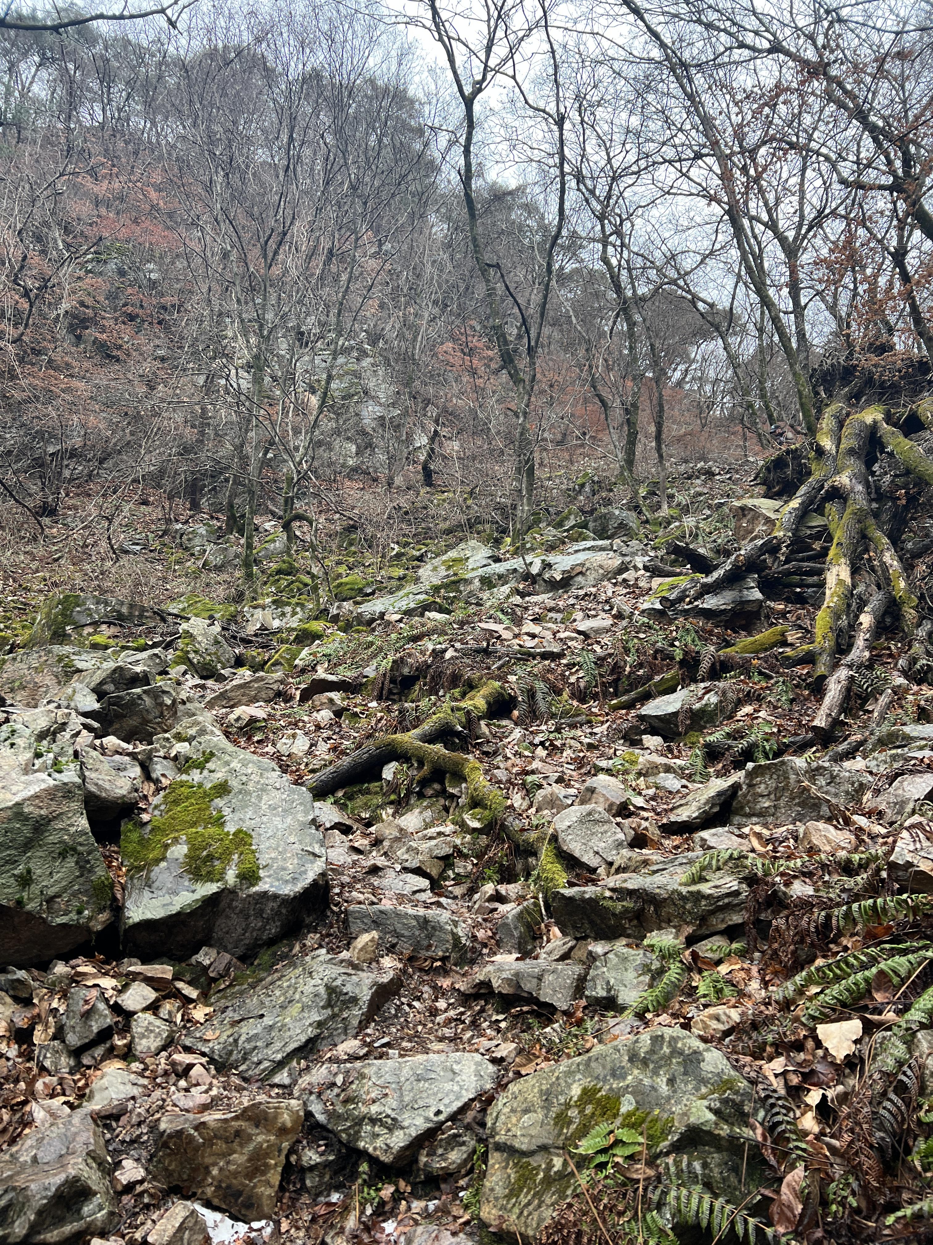 🔺계속해서 암릉 구간이 나오며 위로 진행할 수록 멋진 뷰가 펼쳐집니다. 아쉽게도 제가 등산한 날에는 비가 내리다가 눈으로 바뀌어서 날이 좀 흐렸습니다. 봄과 가을에 방문하면 전반적으로 산이 습해서 운해를 자주 목격할 수 있는 산이기도 합니다.