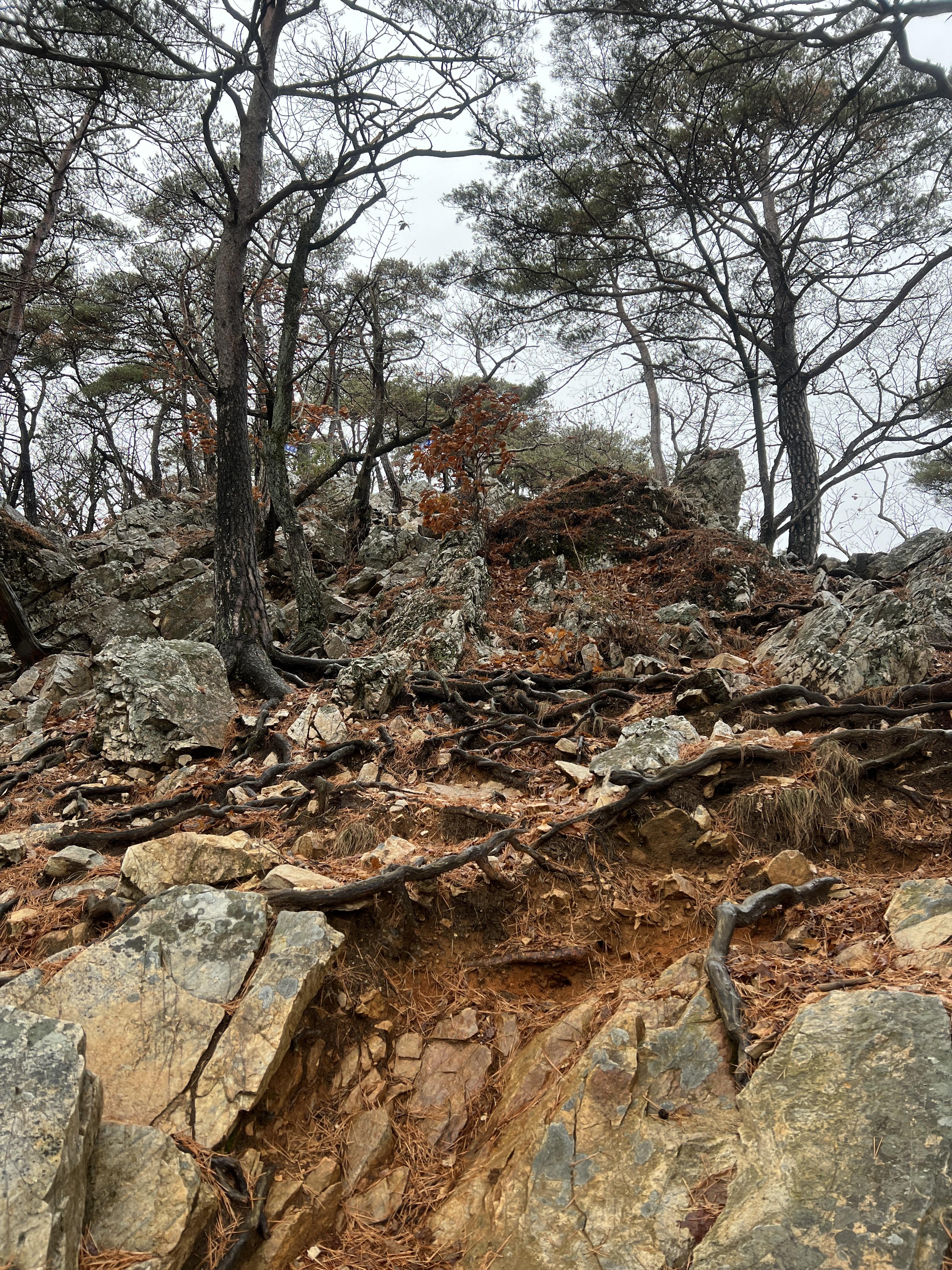 🔺멋진 뷰를 뒤로하고 오르다보면, 이후에는 암릉과 돌계단 그리고 흙길이 번갈아가면서 나옵니다. 정상까지는 매우 짧은길 이라 이런 오르막도 그렇게 오래 걸리지는 않습니다. 중간에 깔딱고개가 하나있는데, 그 고개를 지나면 본격적인 암릉 등산로가 생기기 시작합니다.