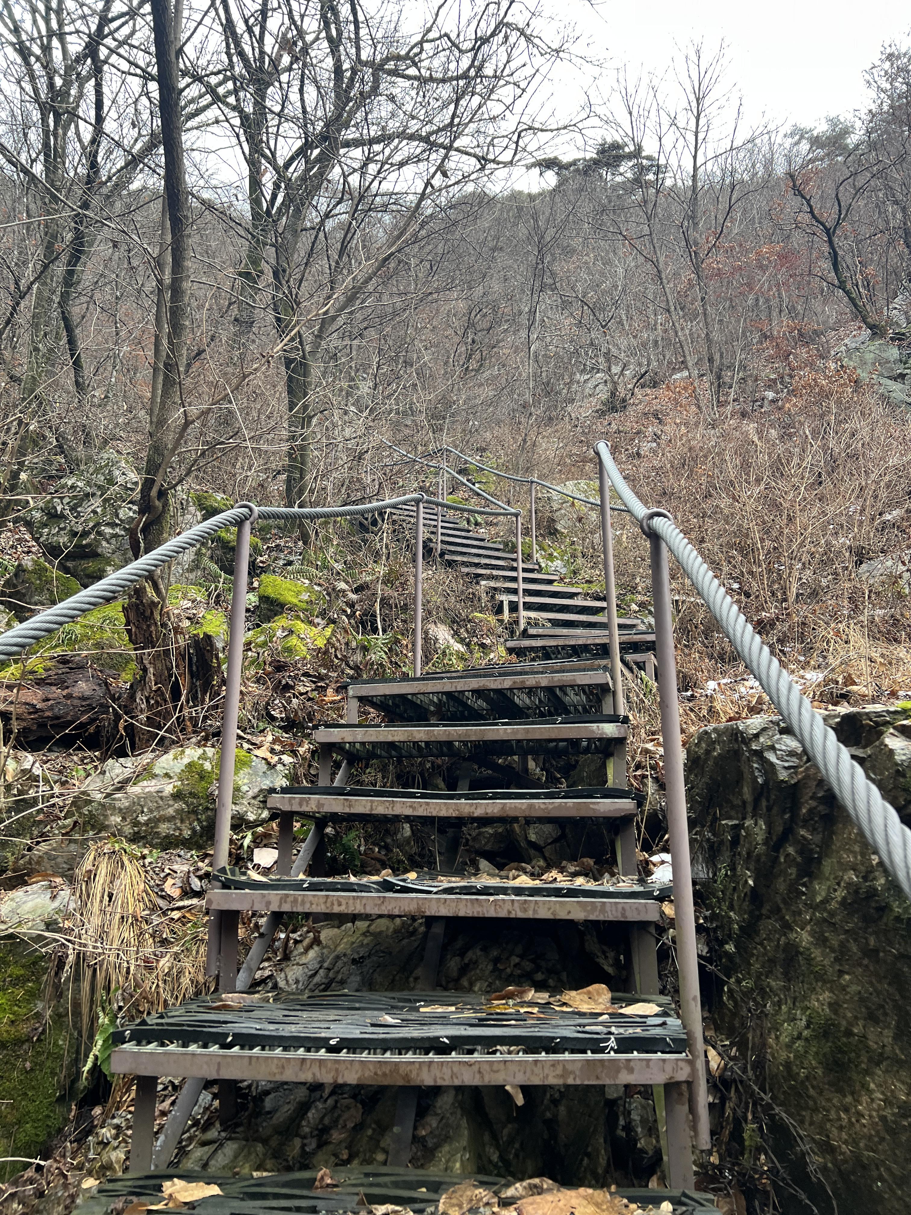 🔺삼악산의 초입은 돌계단과 철계단, 나무계단으로 시작됩니다. 그리고 얼마 안가 암릉 지형으로 바뀌게 되기 때문에 스틱을 사용하시는 것을 추천드리지는 않습니다. 스틱을 사용하기에는 삼악산 매표소를 들머리로 잡는 것보다는 등선폭포 매표소를 들머리로 잡고 가신다면 스틱을 사용할만 합니다.