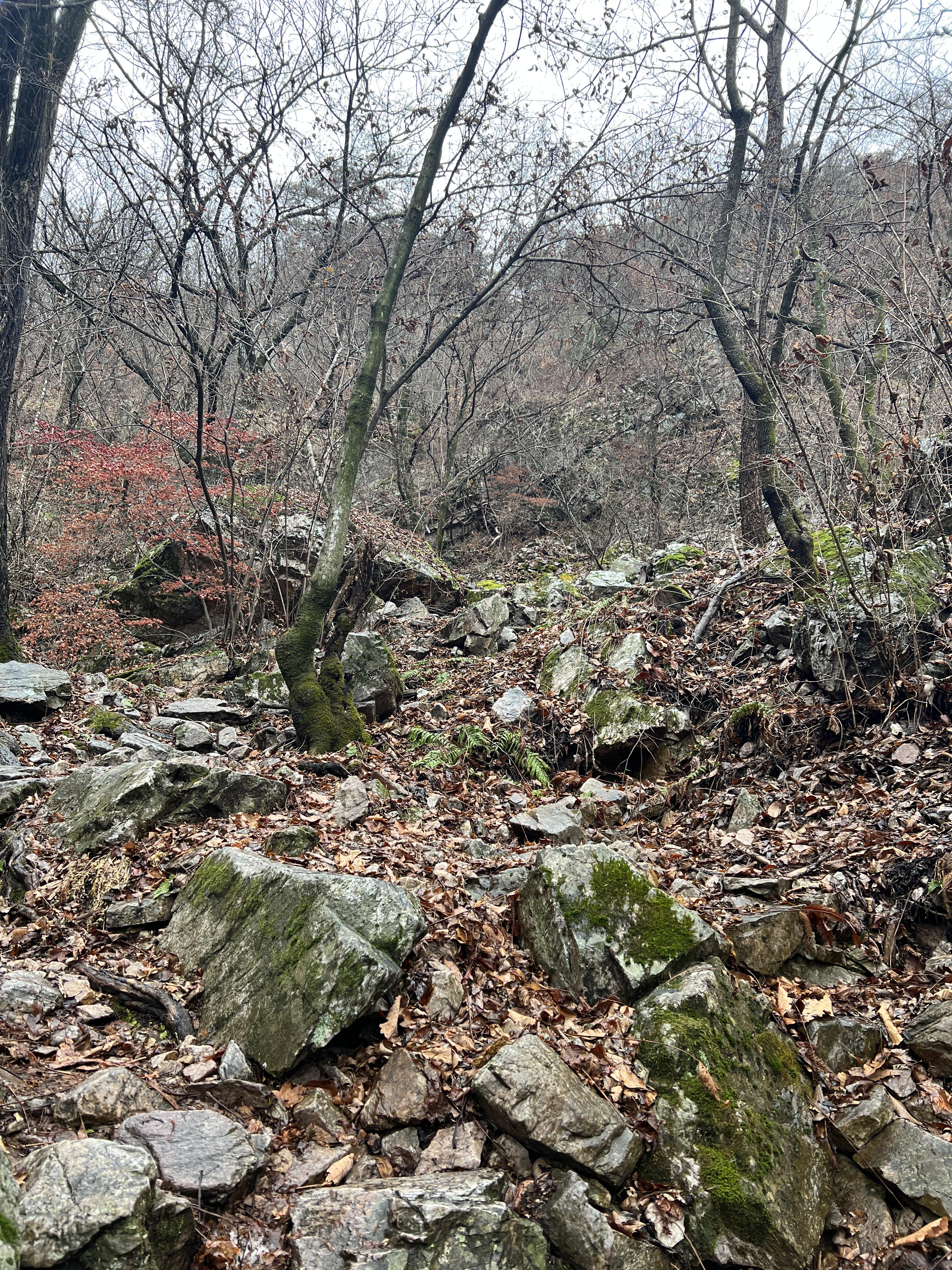 🔺삼악산 상원사를 기점으로 매표사 ~ 상원사까지는 주로 계단이 등산로의 메인코스이지만, 상원사를 넘어가게 되면 아래보이는 돌들이 마구자비로 있는 등산로로 변하게됩니다. 삼악산은 본디 원래 암산이었으며, 상원사 ~ 본격적인 암릉코스 이전까지가 바로 깔딱고개입니다.