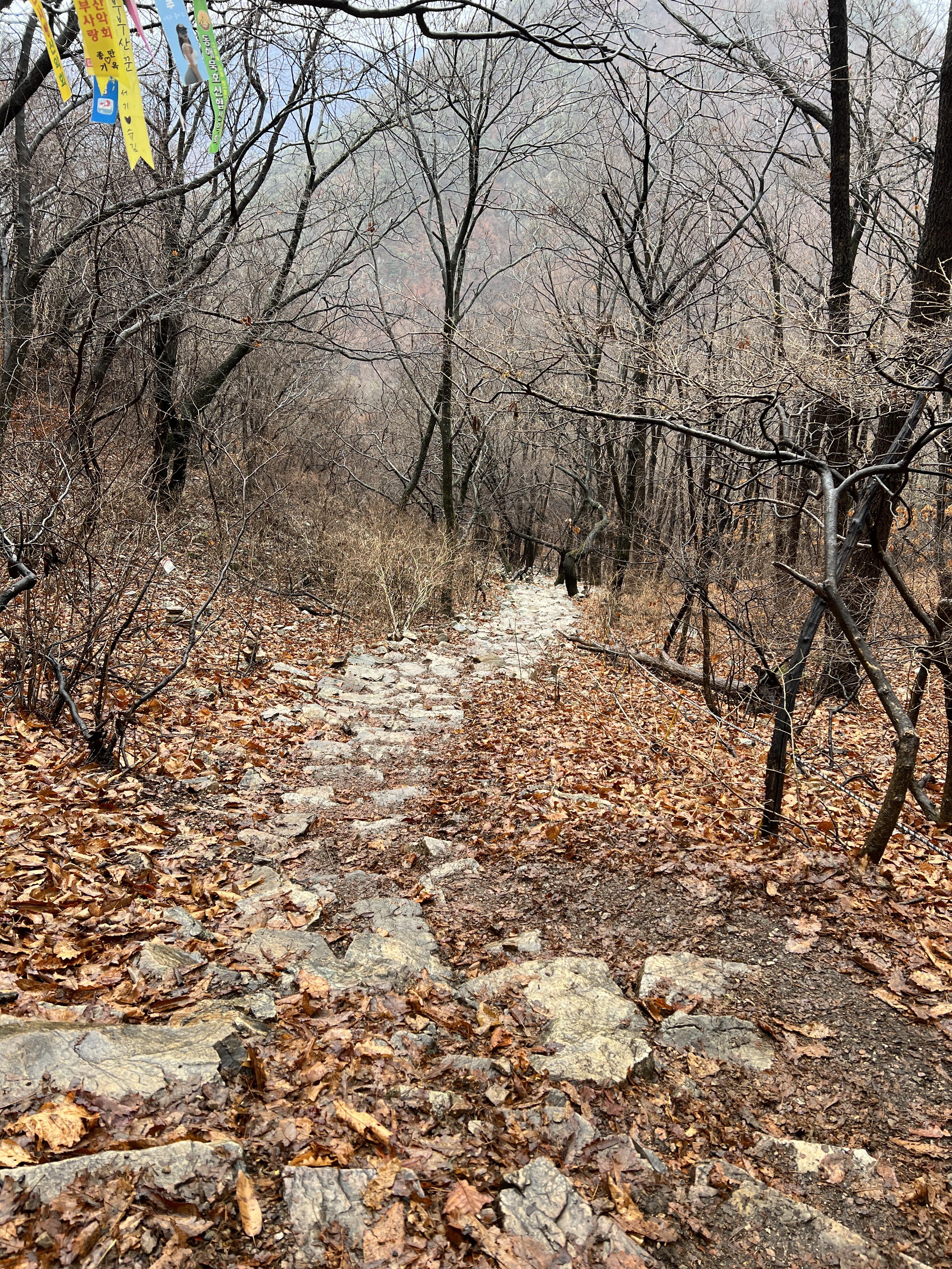 🔺어느정도 높이 놀라간다면 이후에는 거의 평지로 이뤄진, 즉 능선길을 걷는 암릉코스가 나오게 됩니다. 특히 3번째 사진에서 전망대가 보이기 시작한다면 정상까지 거의 다온겁니다. 위 3번째 전망대에서 정상까지는 약 15분 정도 소요됩니다. 비가오는날 날이 꽤 추웠는데, 정상부에서는 갑자기 눈으로 바껴서 좀 당황했습니다.