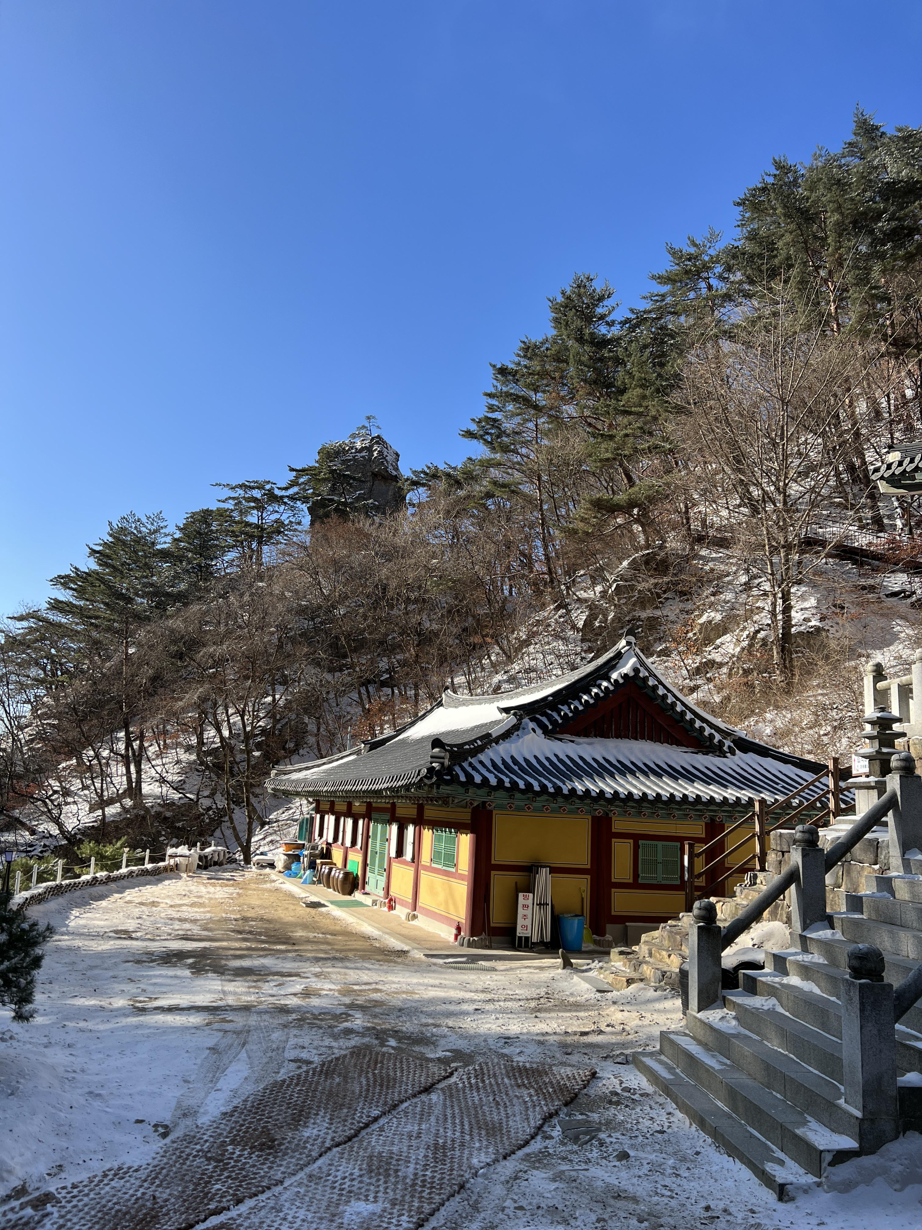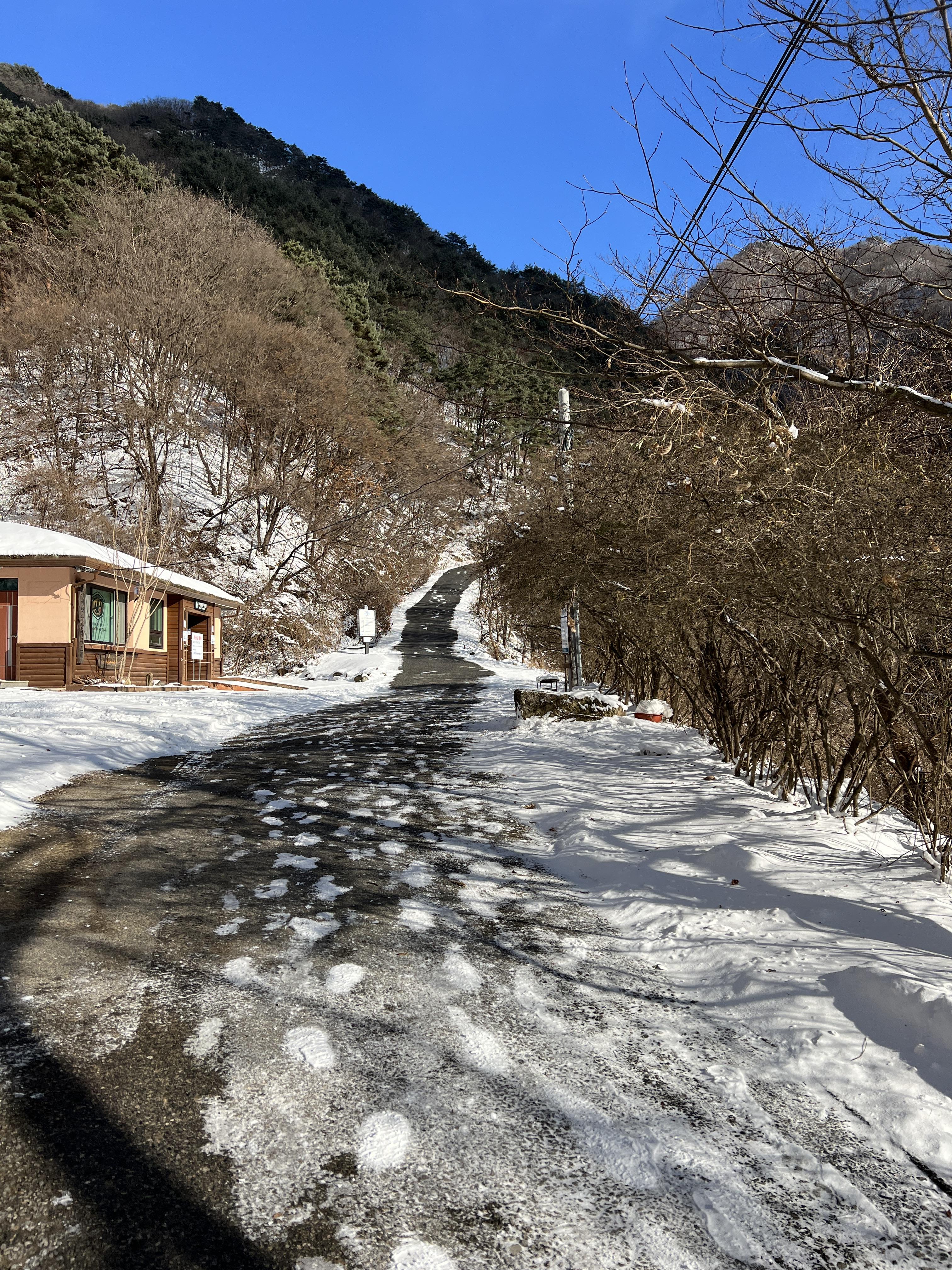 또 겨울에는 입석사까지 아스팔트길이기 때문에 주차장~입석사까지는 아이젠을 착용하지 않고 오르며, 입석사에서부터 본격적인 돌계단이 시작되어, 많은 사람들이 이곳에서 재정비를 하고 산에 오를 준비를 합니다.