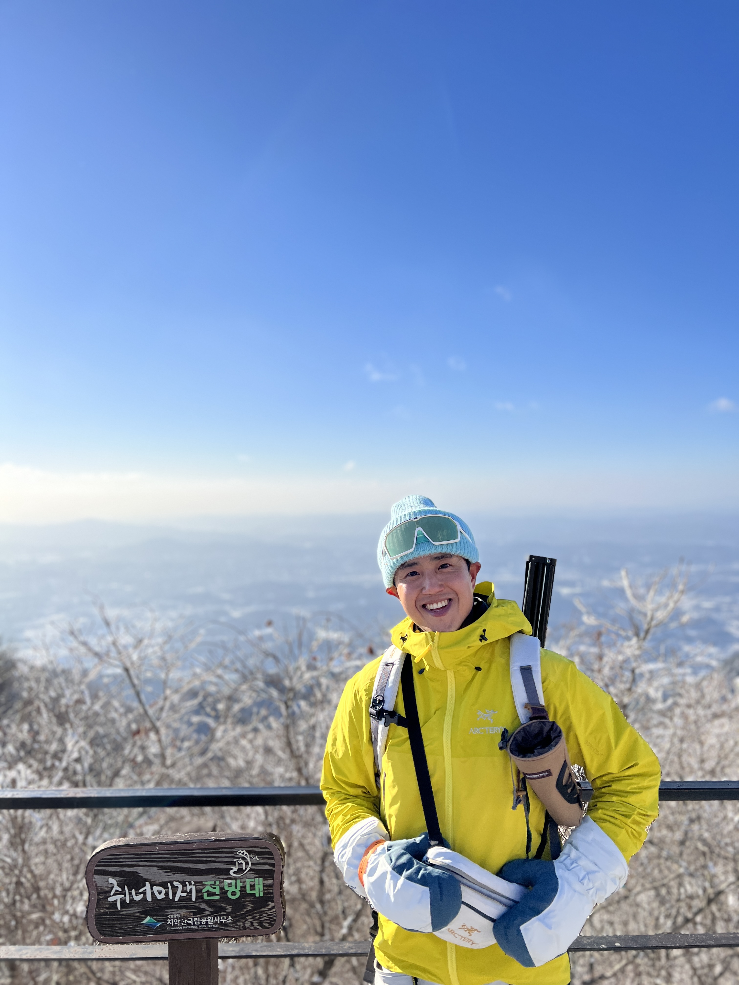 🔺헬기장 있는대 까지 올라갔으나, 하늘은 푸른데 상고대는 거의 떨어지고, 뒤쪽 비로봉쪽에 바람이 엄청 불어 정상은 여기서 멈추고 상고대 놀이를.. 이미 치악산 정상은 수없이 가봤기에, 상고대랑 노는게 더 소중하다고 느꼈다봅니다.