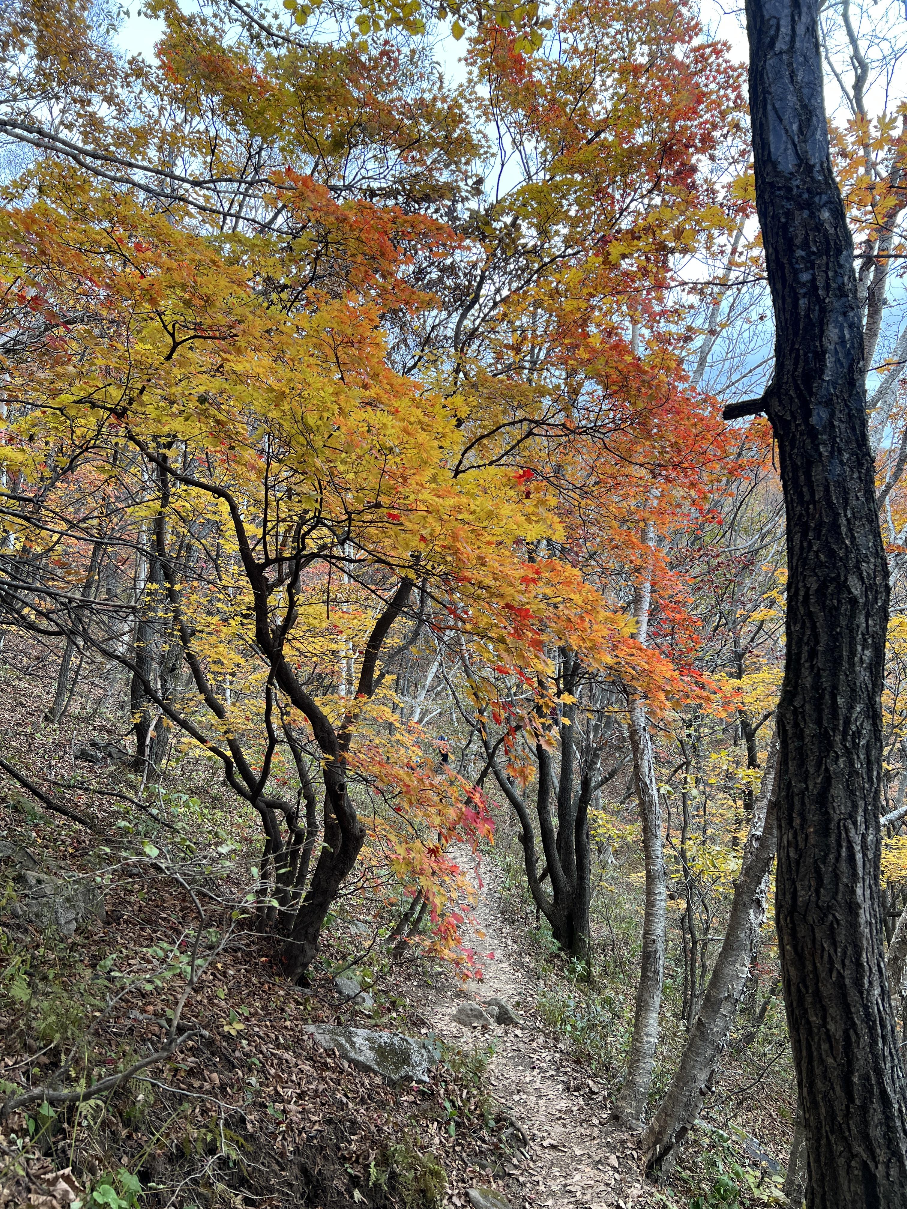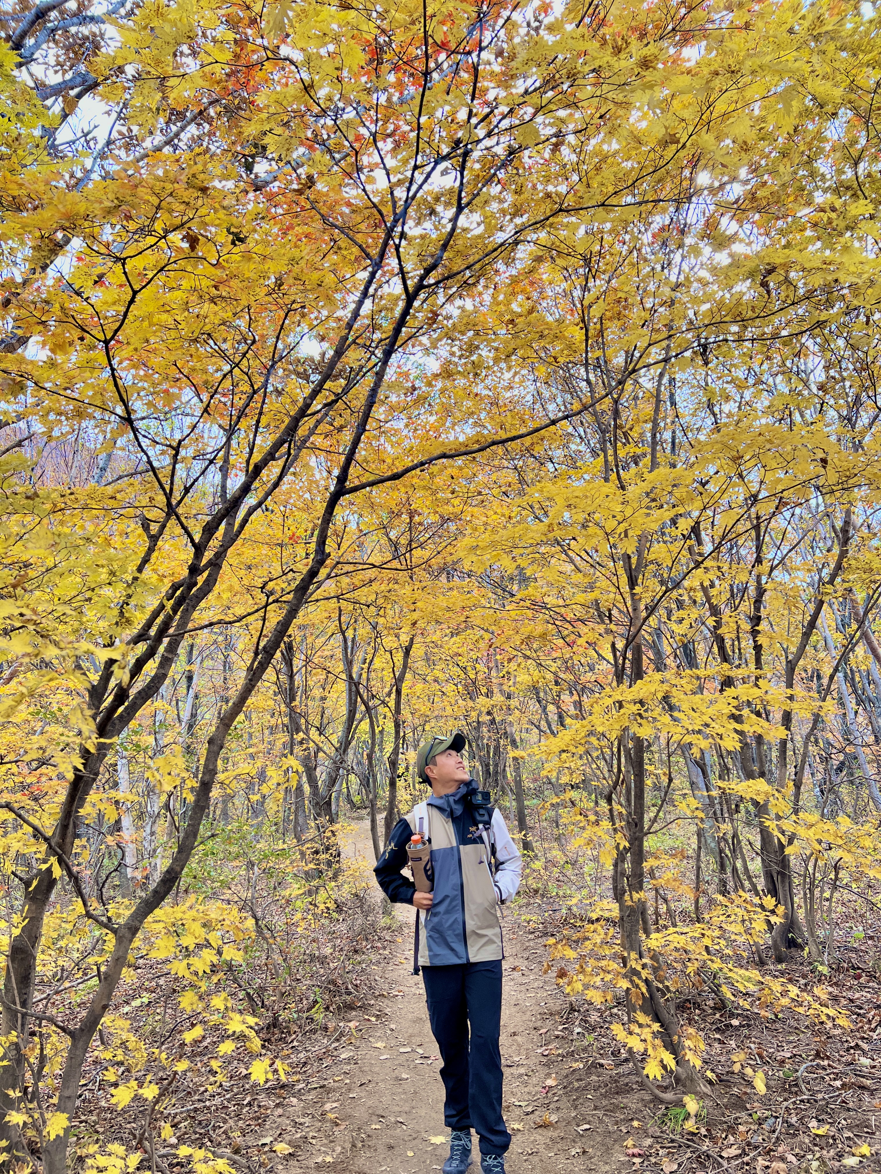 🔺등산로 역시 평균경사도가 3도 내외이며, 거의 평지라 보시면 됩니다. 일부 엄청 짧은 깔딱구간이 존재하지만 아파트 계단 3-4층 높이의 오르막이 이어지는 수준이기에 많은 일반인과 나이가 있으신 분들도 쉽게 갈 수 있는 코스입니다. 특이 이 구간에 노란색 단풍과 붉은색 단풍이 형형색색 피어 있는데, 나무의 크기가 높고 가지가 등산로로 뻗어 단풍 터널을 만들어서 오르막의 힘듬 보다는 오르막을 오를때 단풍을 구경하는 재미가 있습니다.