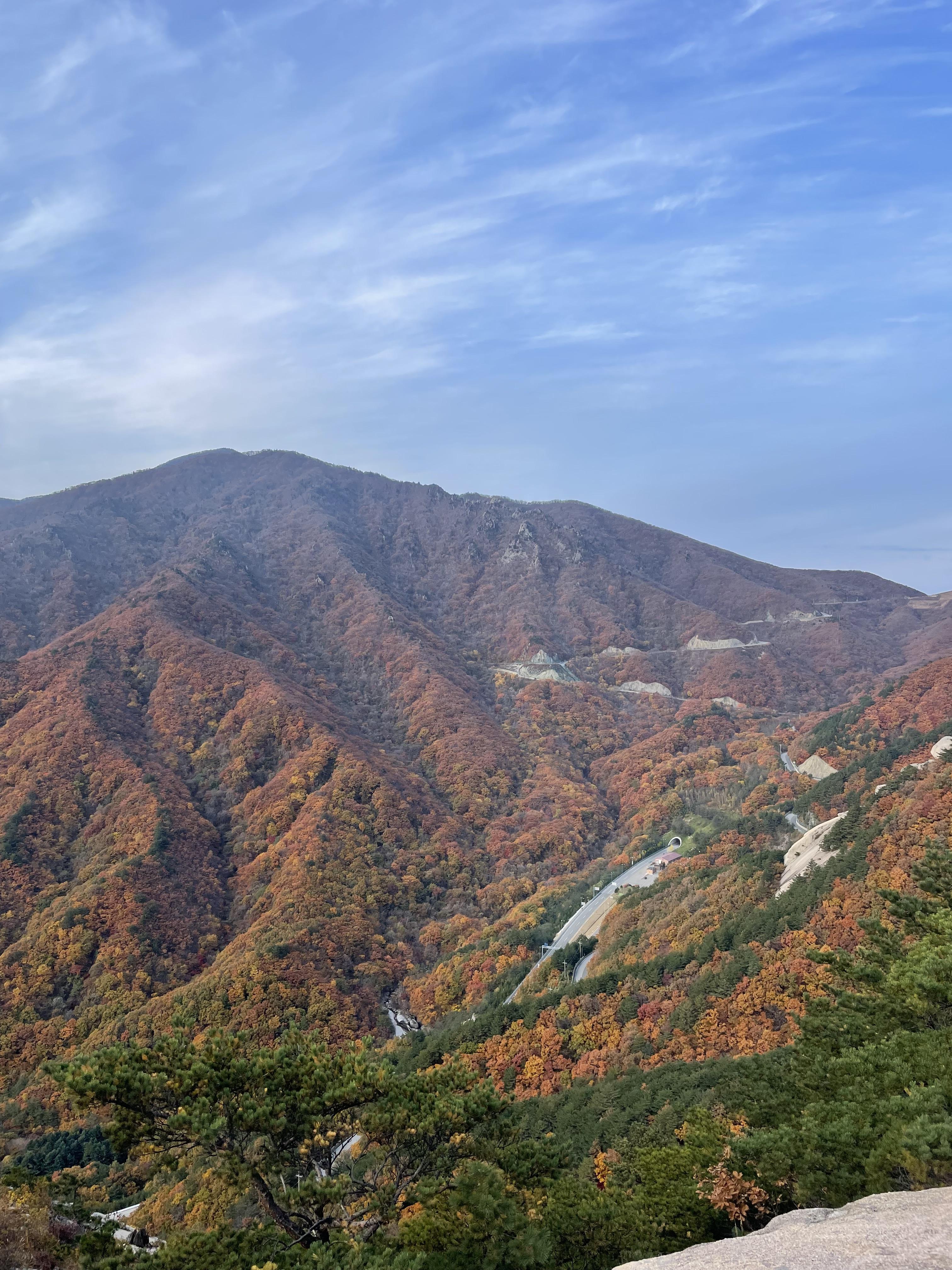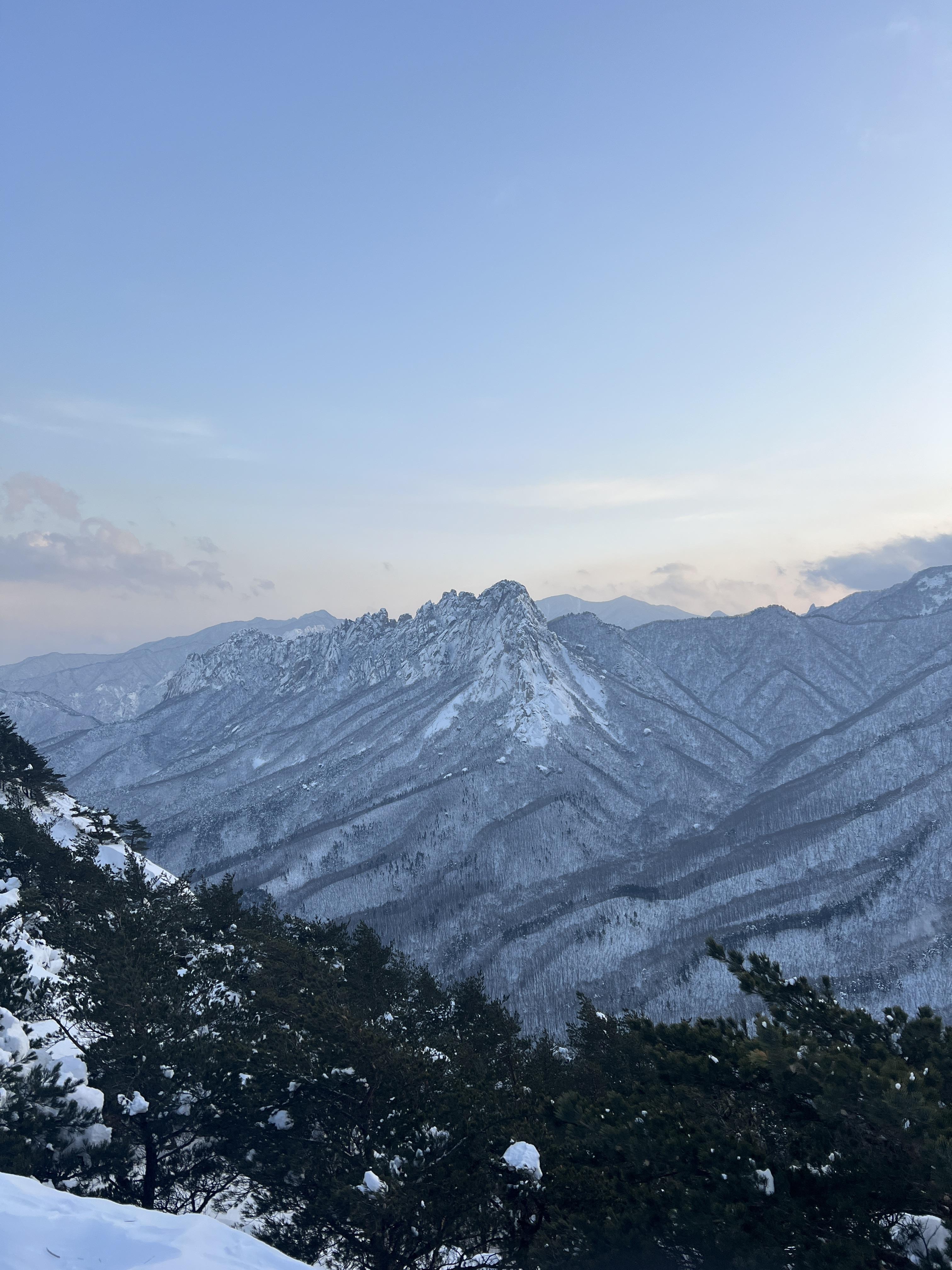 🔺설악산의 울산바위가 보이는 금강산 성인대는 4계절 모두 멋진 뷰를 자랑한다. 특히 봄에는 앙상한 돌의 형상 그대로를 느낄 수 있으며, 여름에는 초록 옷을 입고, 가을에는 마치 연회를 준비하듯 초록 옷에서 주황색 옷으로 탈바꿈을 시작한다. 이후 겨울에는 울산바위에 눈이 쌓이면서 차가운 이미지를 우리에게 보여주는데, 나는 4계절 모두 멋진 듯 하다.