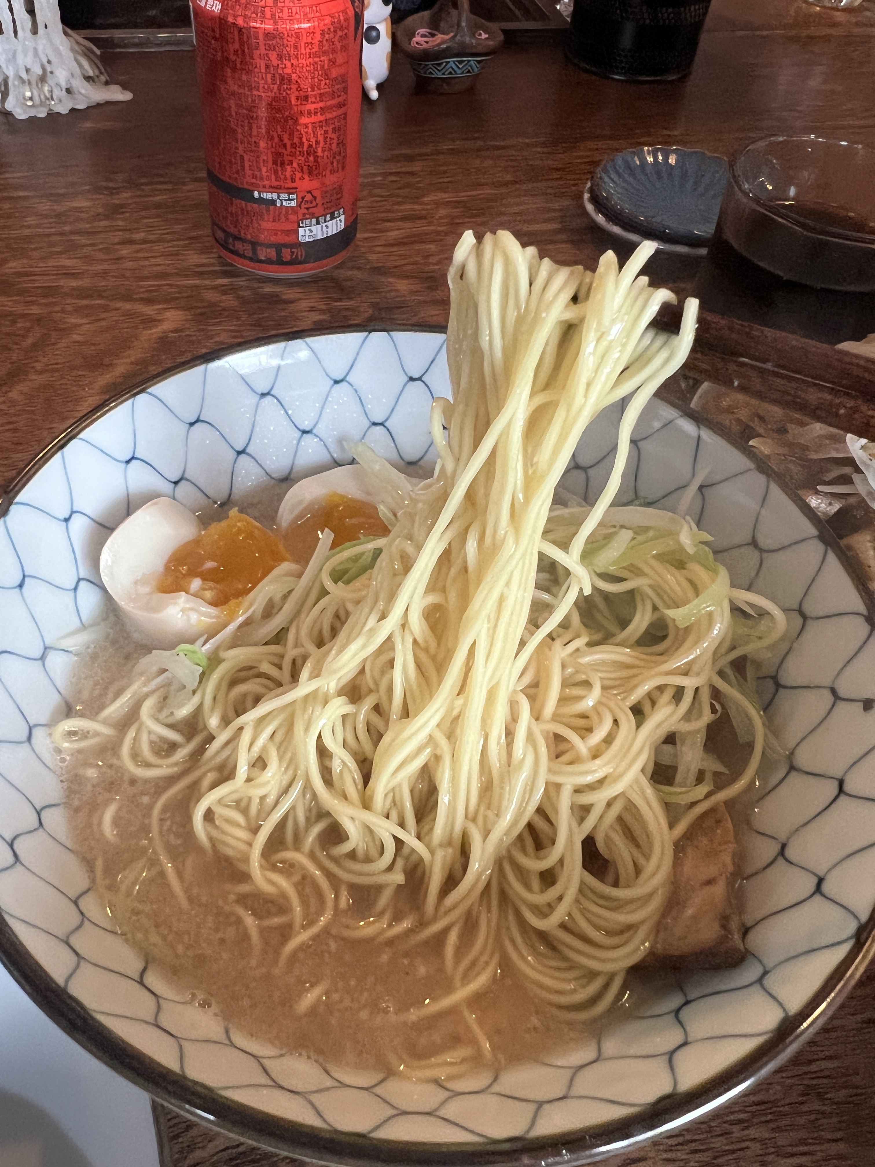 타마고는 반으로 가르면 노른자가 흘러나올 줄 알았는데, 완전 반숙은 아니다. 반반숙 정도? 면은 생면으로 똑똑 끊어지는게 깔끔하다.