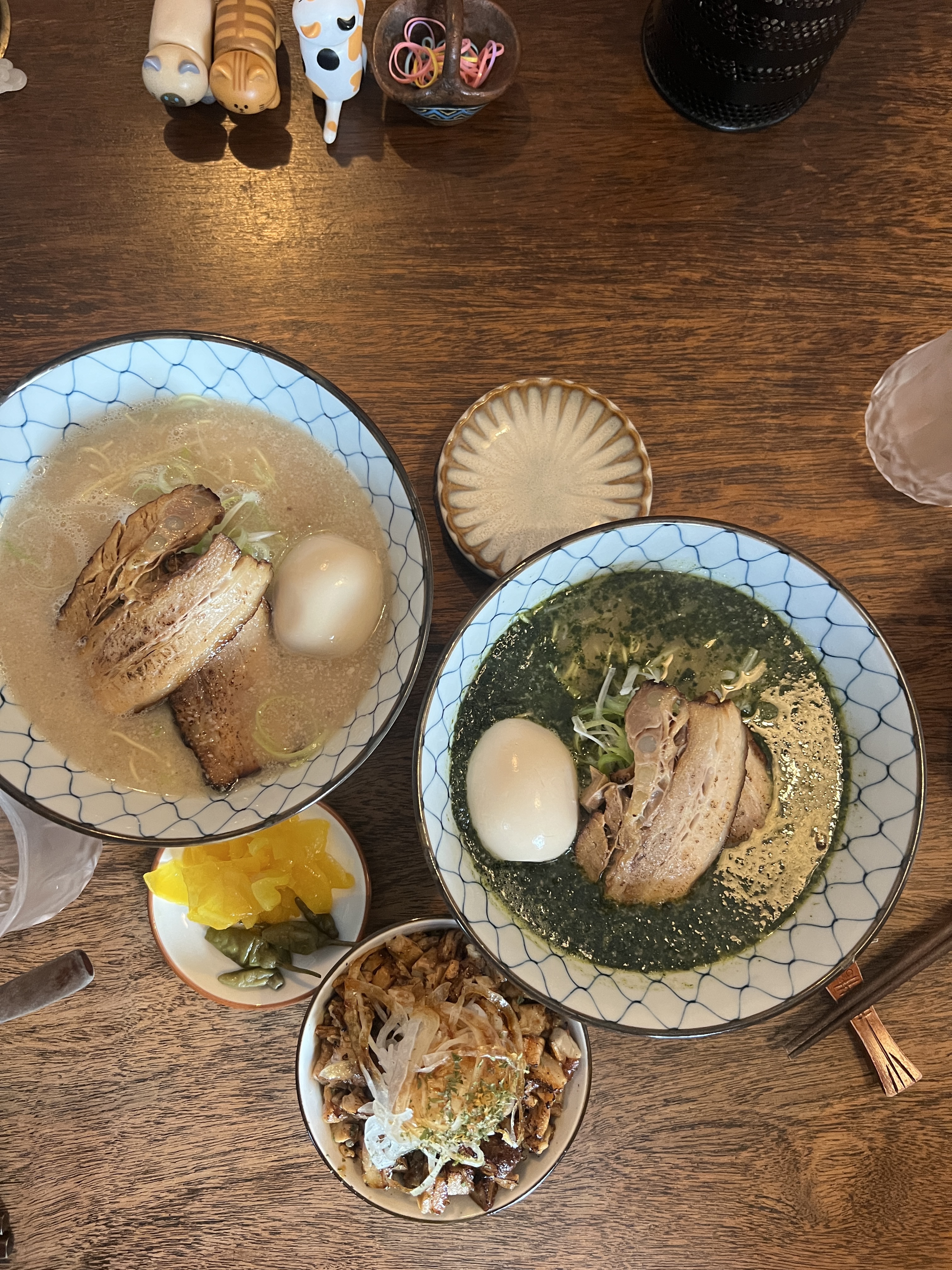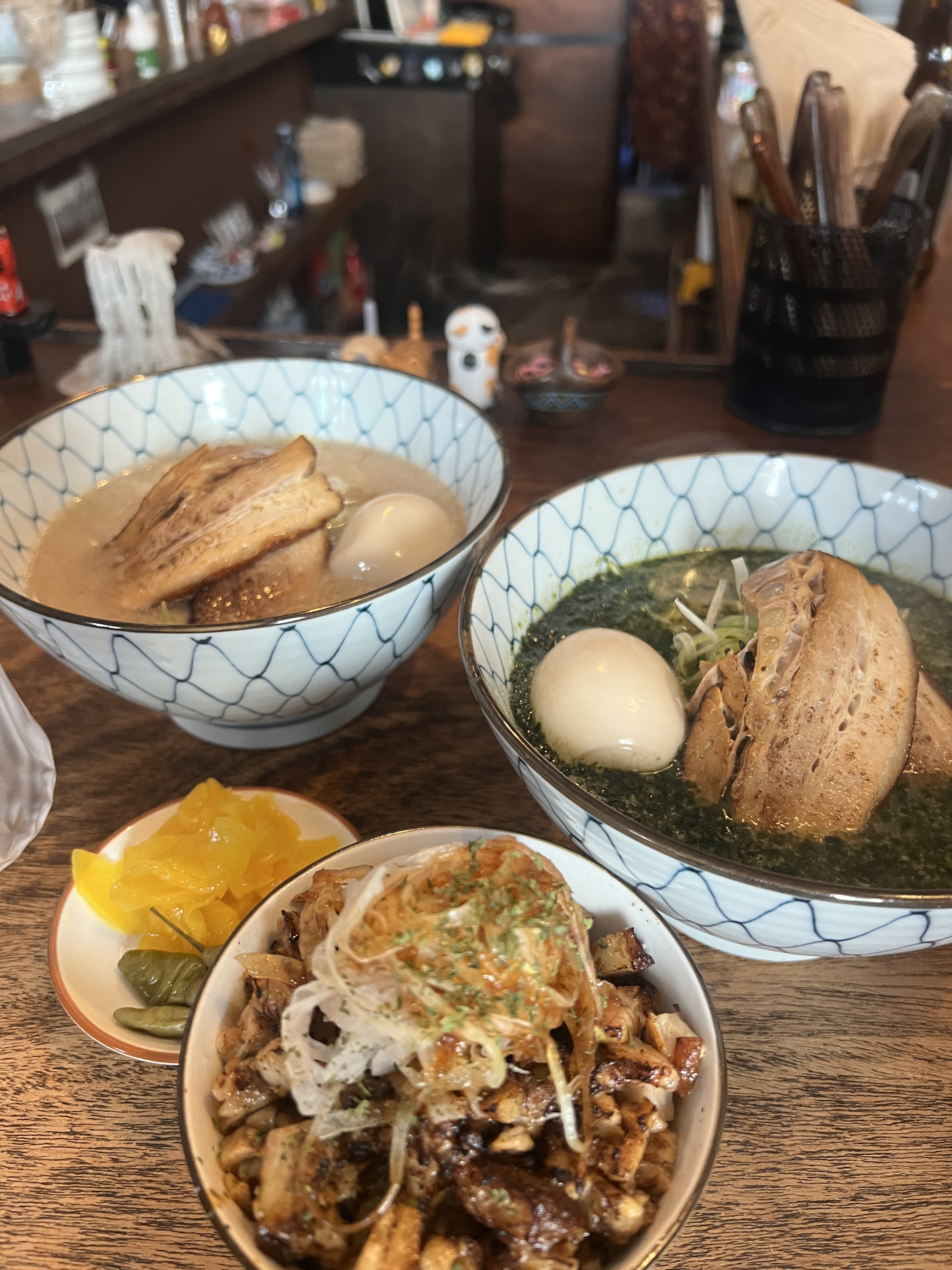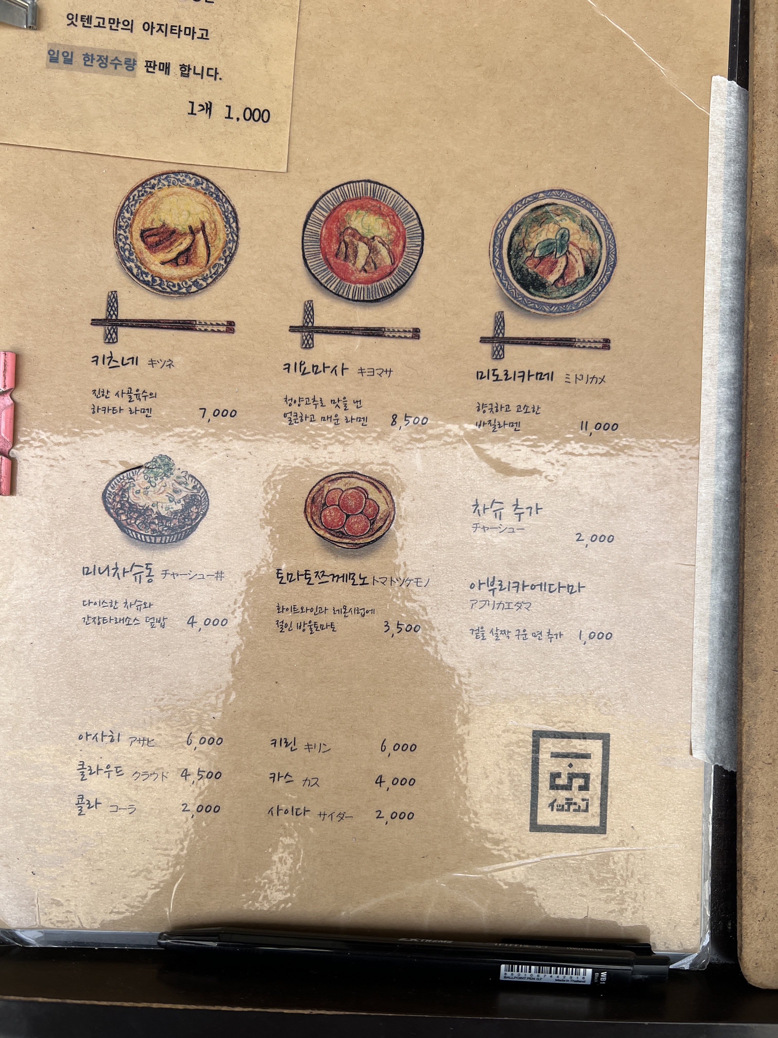 메뉴는 키츠네, 키요마사, 미도리카메, 미니차슈동, 토마토쯔게모노가 있으며, 나는 여자친구와 키츠네, 미도리카메, 미니차슈동을 주문하여 먹었다. 여기 메인은 미도리카메라고 한다. 바질을 올려 만든 라멘으로 향긋하고 깔끔한 맛이 나는 것이 특징인데 자세한건 아래 설명하기로 한다.