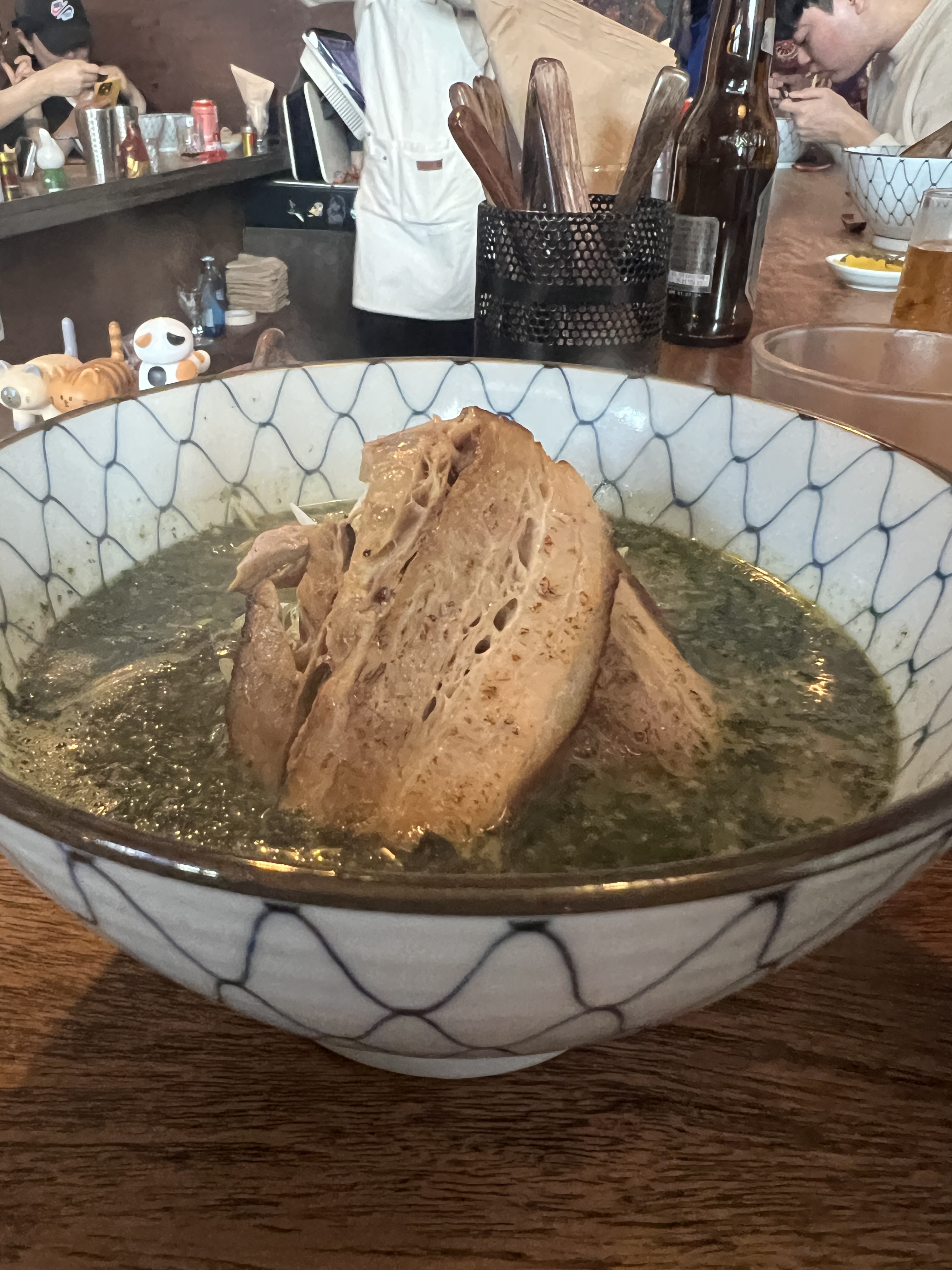 이게 진짜 메인이다. 미도리카메는 바질을 듬뿍 넣어주는데, 일단 바질 향이 싫어하는 사람들에게는 별로겠고, 라멘 특유의 느끼함을 바질이 다 잡아준다. 그래서 상당히 깔끔하다. 난 여기는 무조건 미도리카메 추천! 고기는 베어무는 순간 육즙이 터져나오고 불향맛이 입속으로 확 퍼진다. 이후국물의 담백함이 맴돌고 바질의 상큼함과 깔끔함이 입속을 처음으로 되돌려준다.