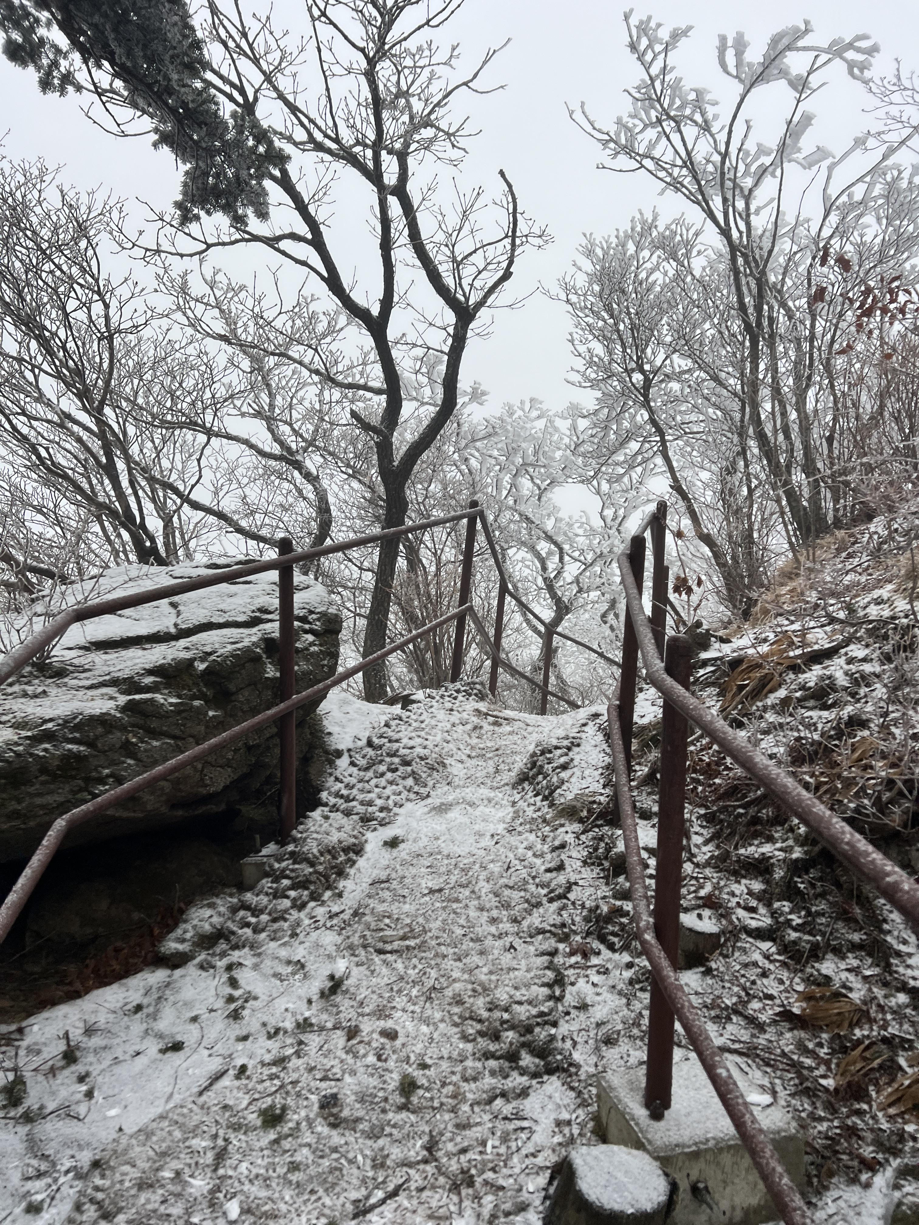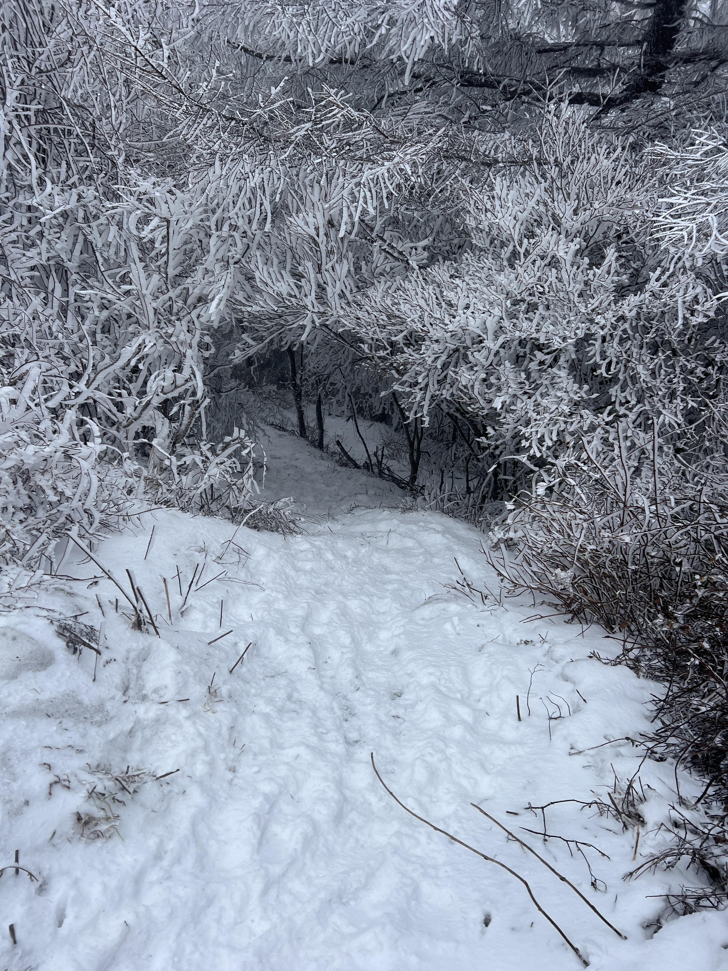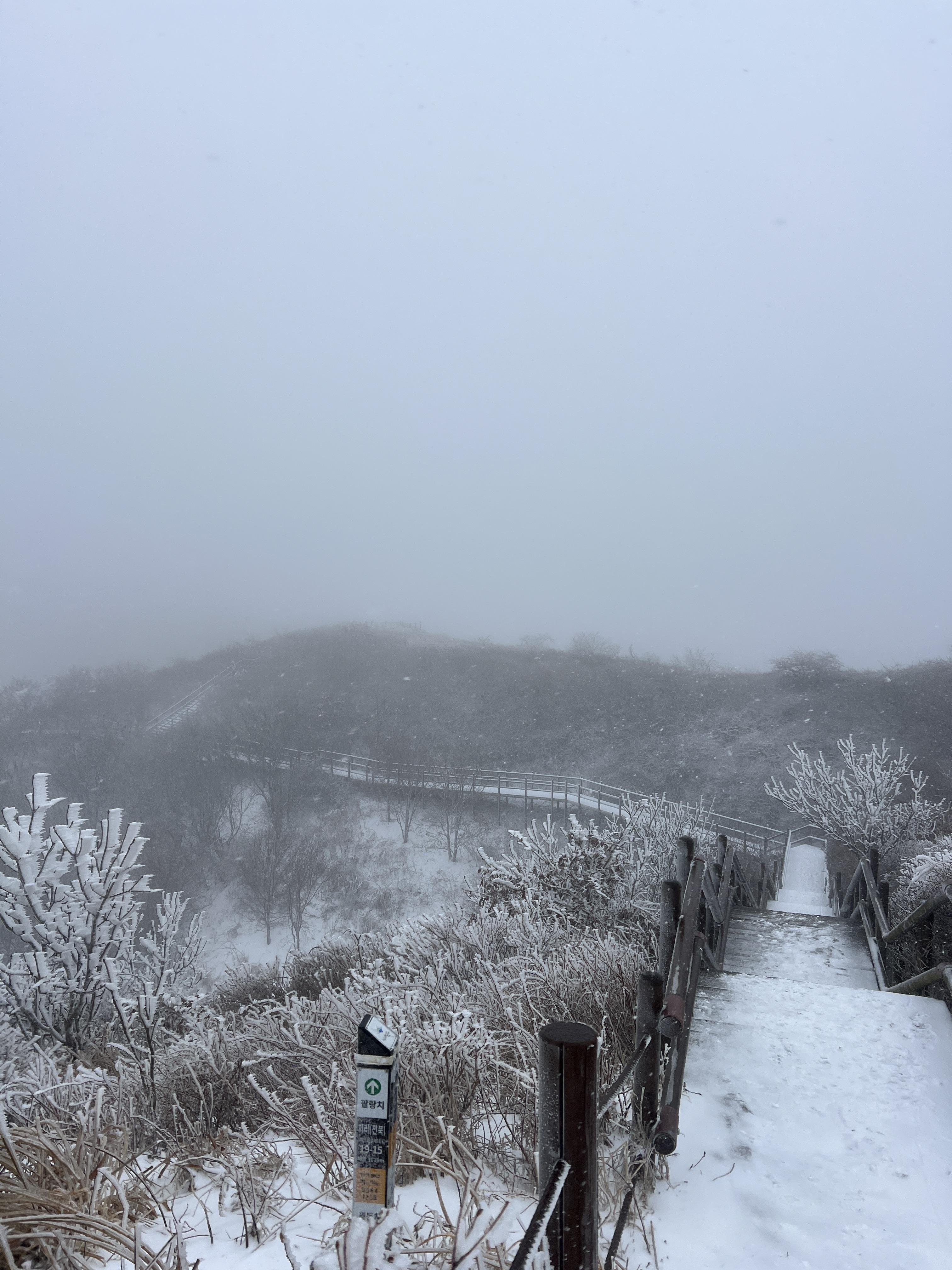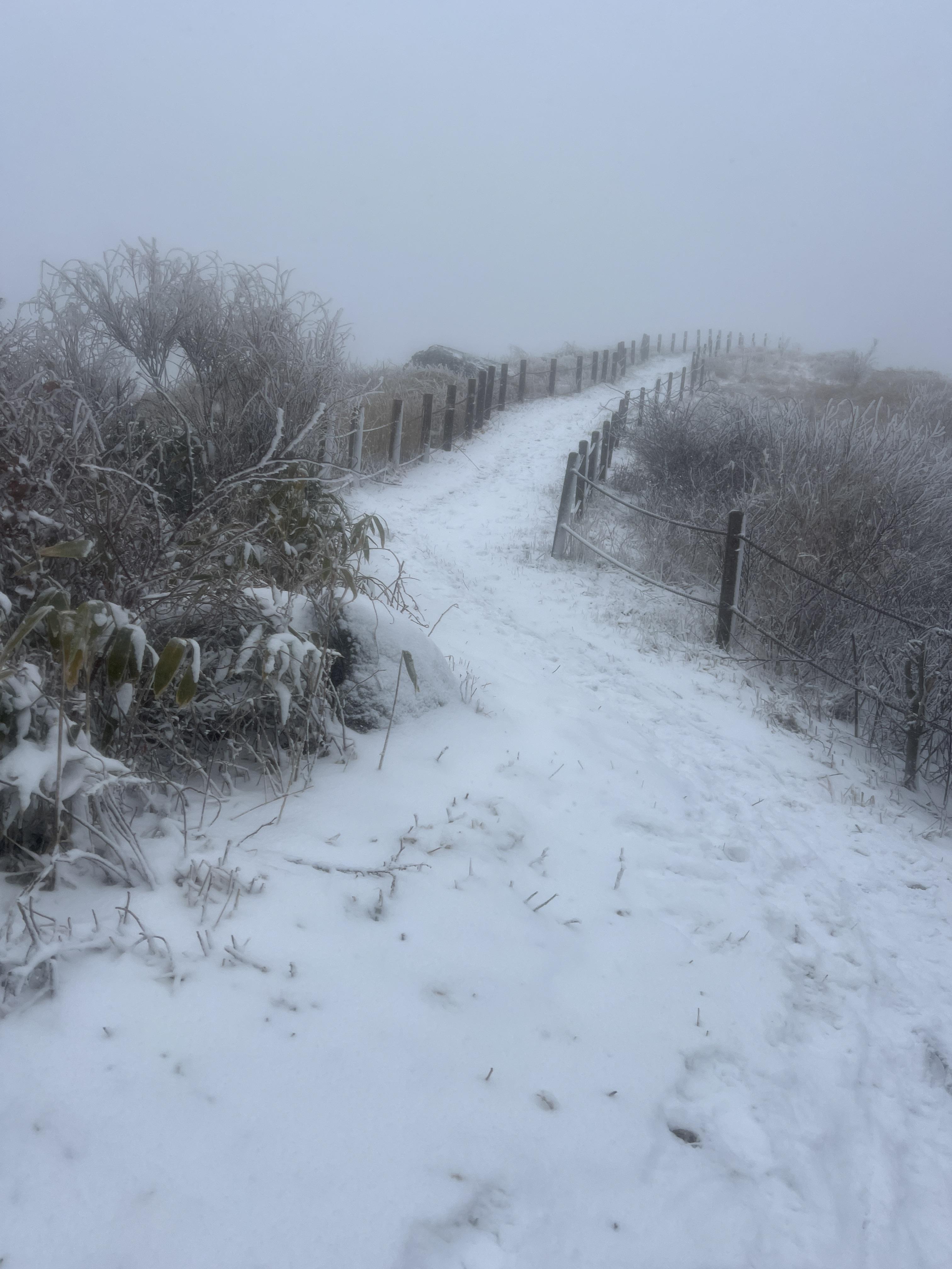 올라가면서 점점 눈밭으로 변해간다. 안개로 시야가 거의 없었지만 외길이라 찾아가는데는 문제가 딱히 없다. 다만 묘봉치까지 계속 오르막이라 체력 분배를 정말 잘해야한다.