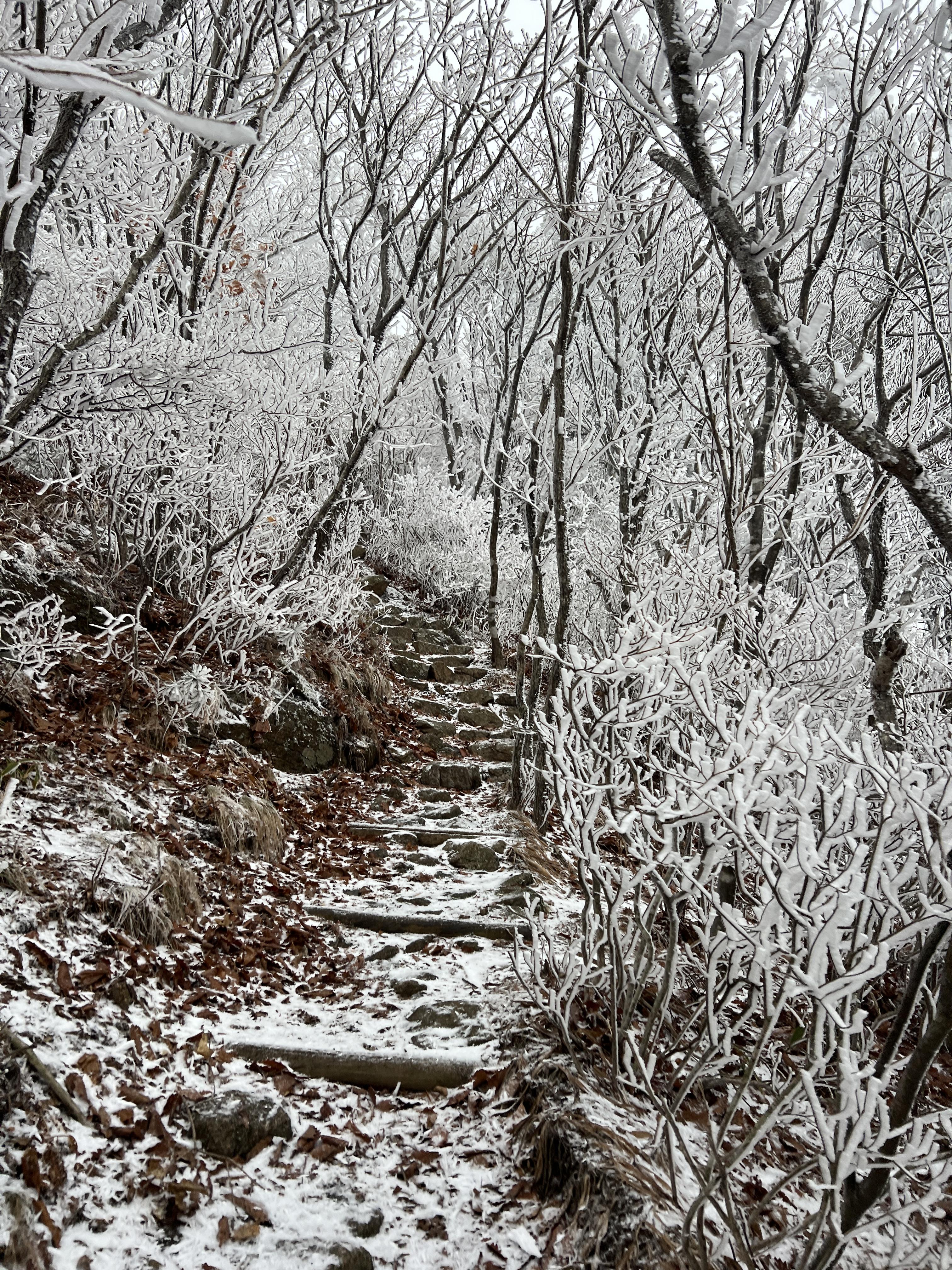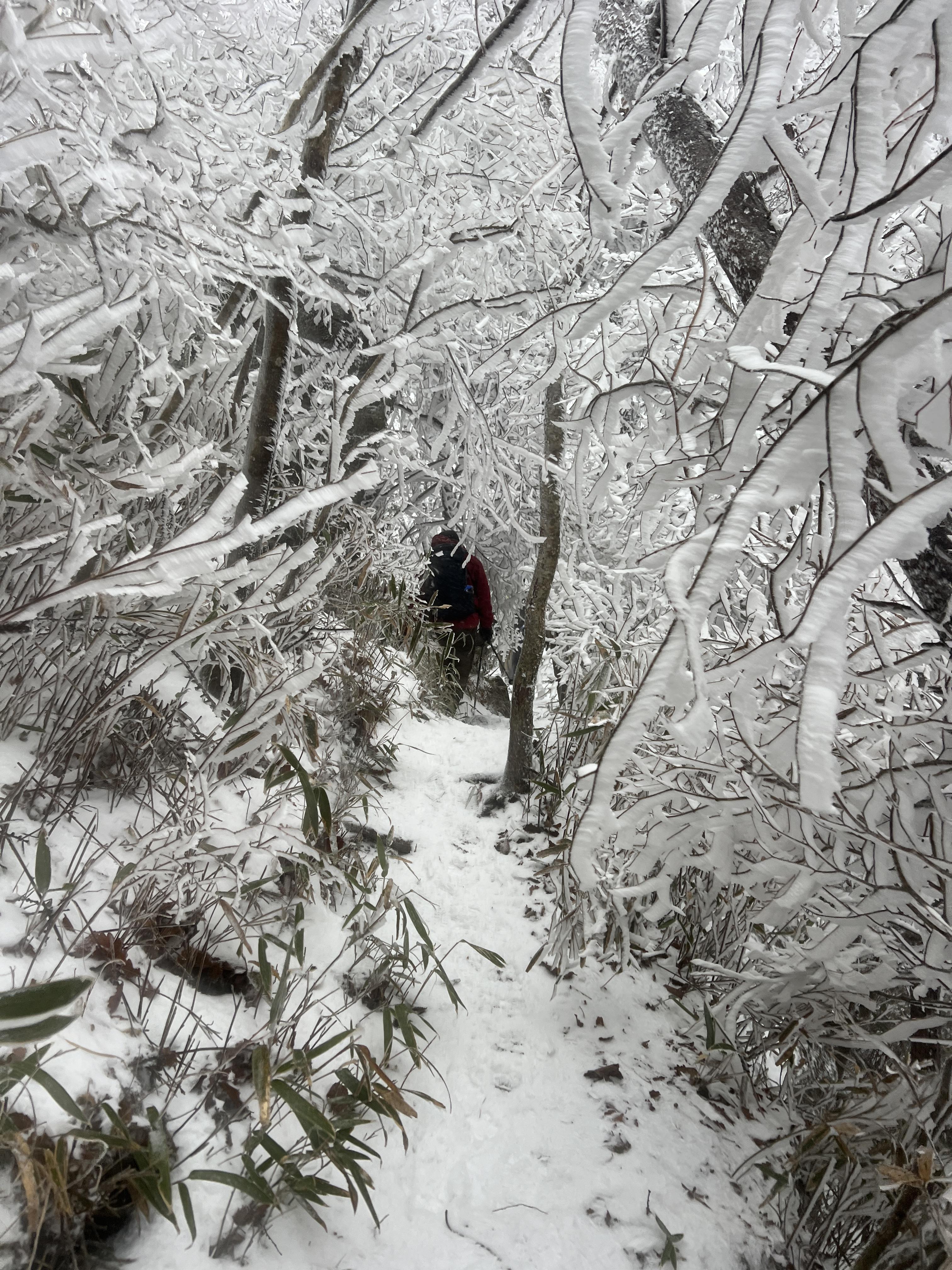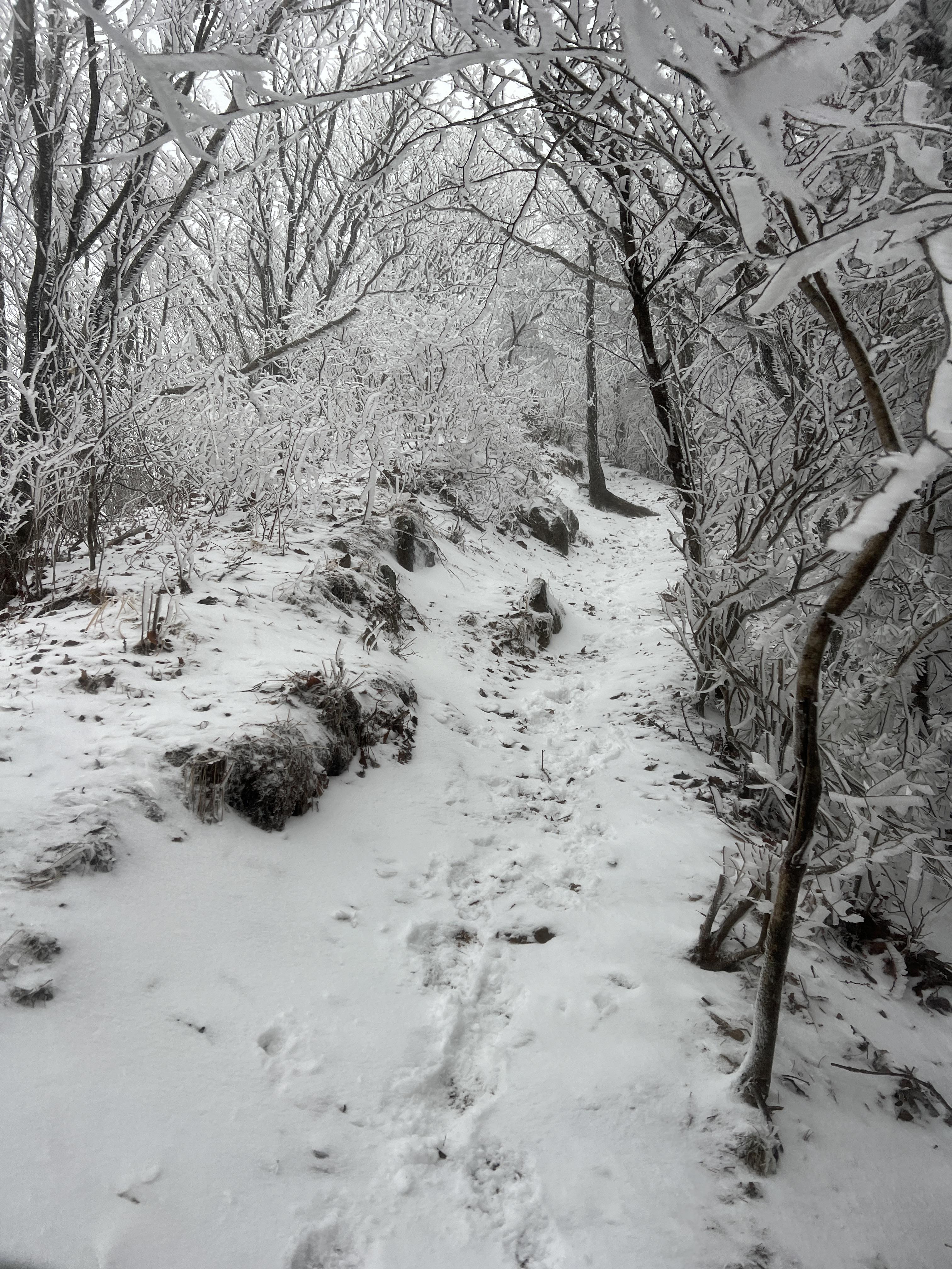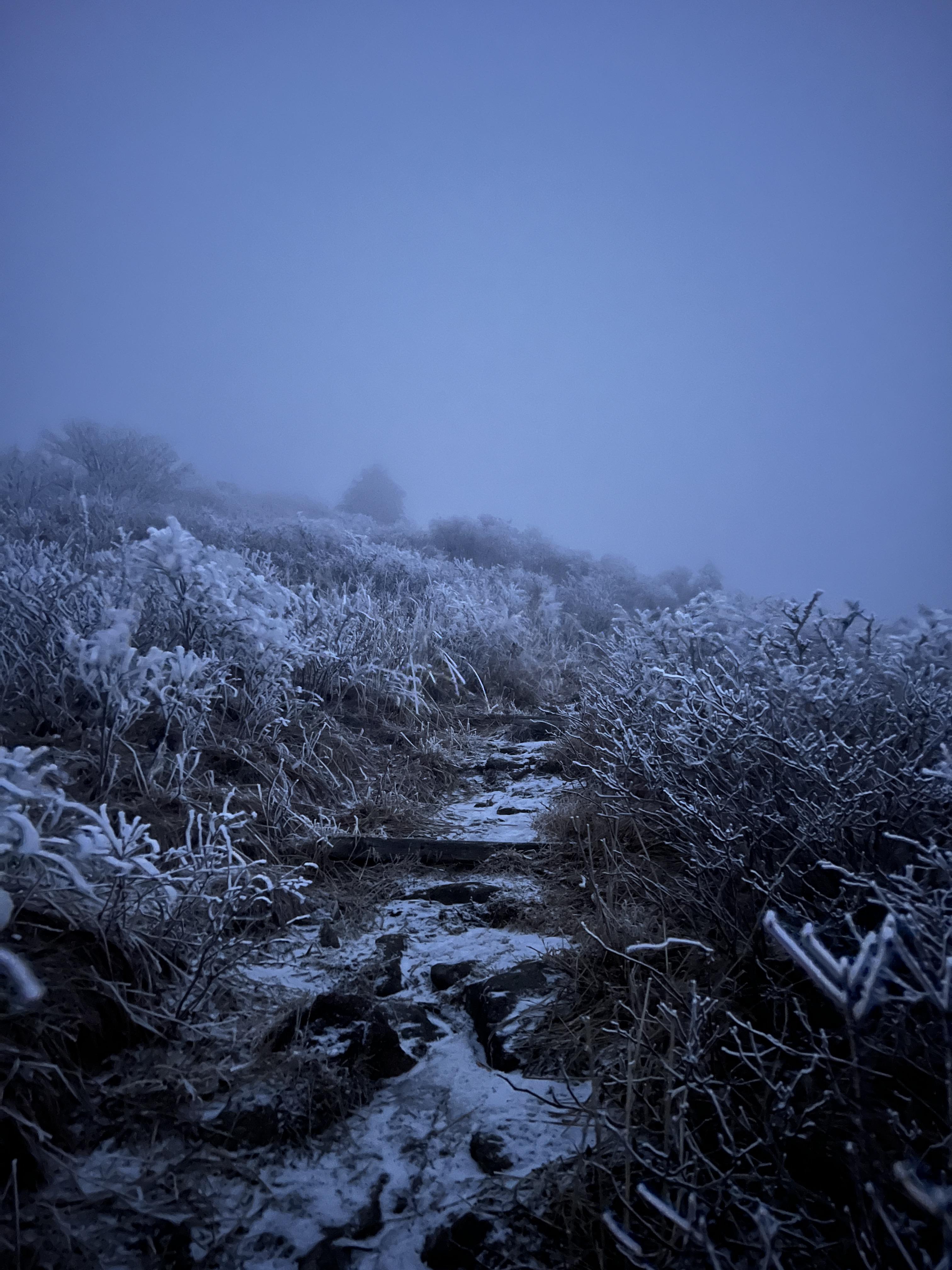 올라가면서 점점 눈밭으로 변해간다. 안개로 시야가 거의 없었지만 외길이라 찾아가는데는 문제가 딱히 없다. 다만 묘봉치까지 계속 오르막이라 체력 분배를 정말 잘해야한다.