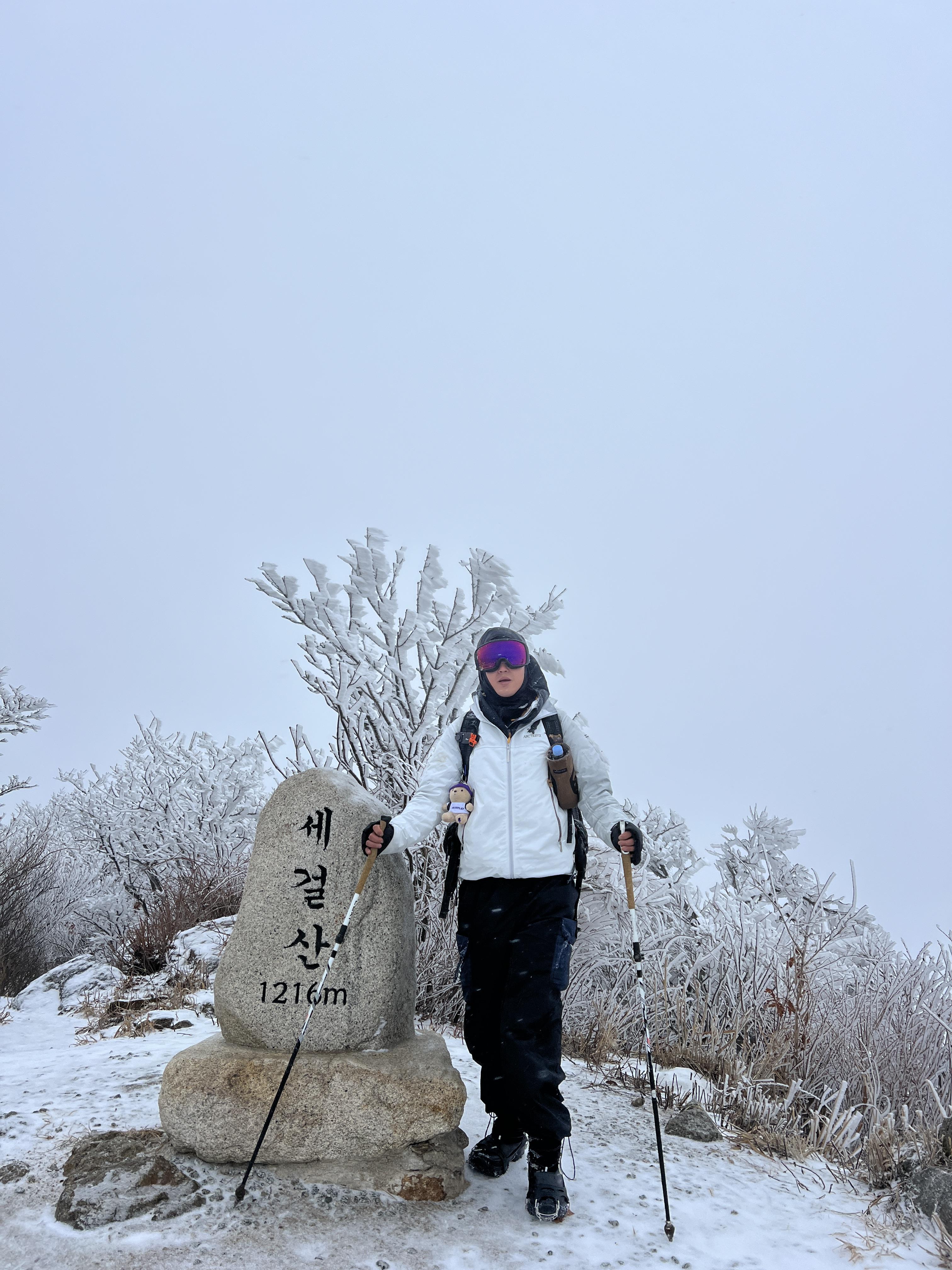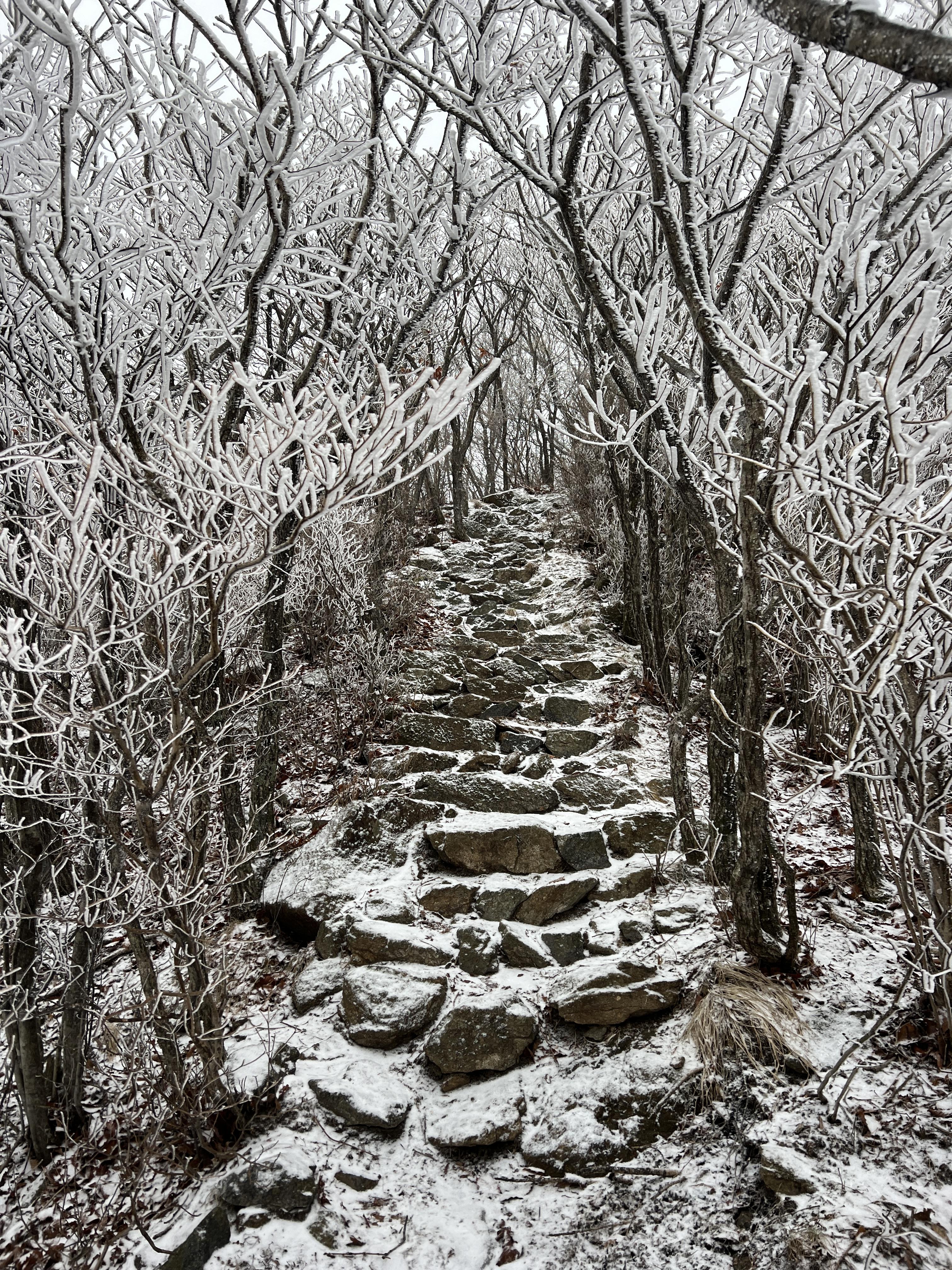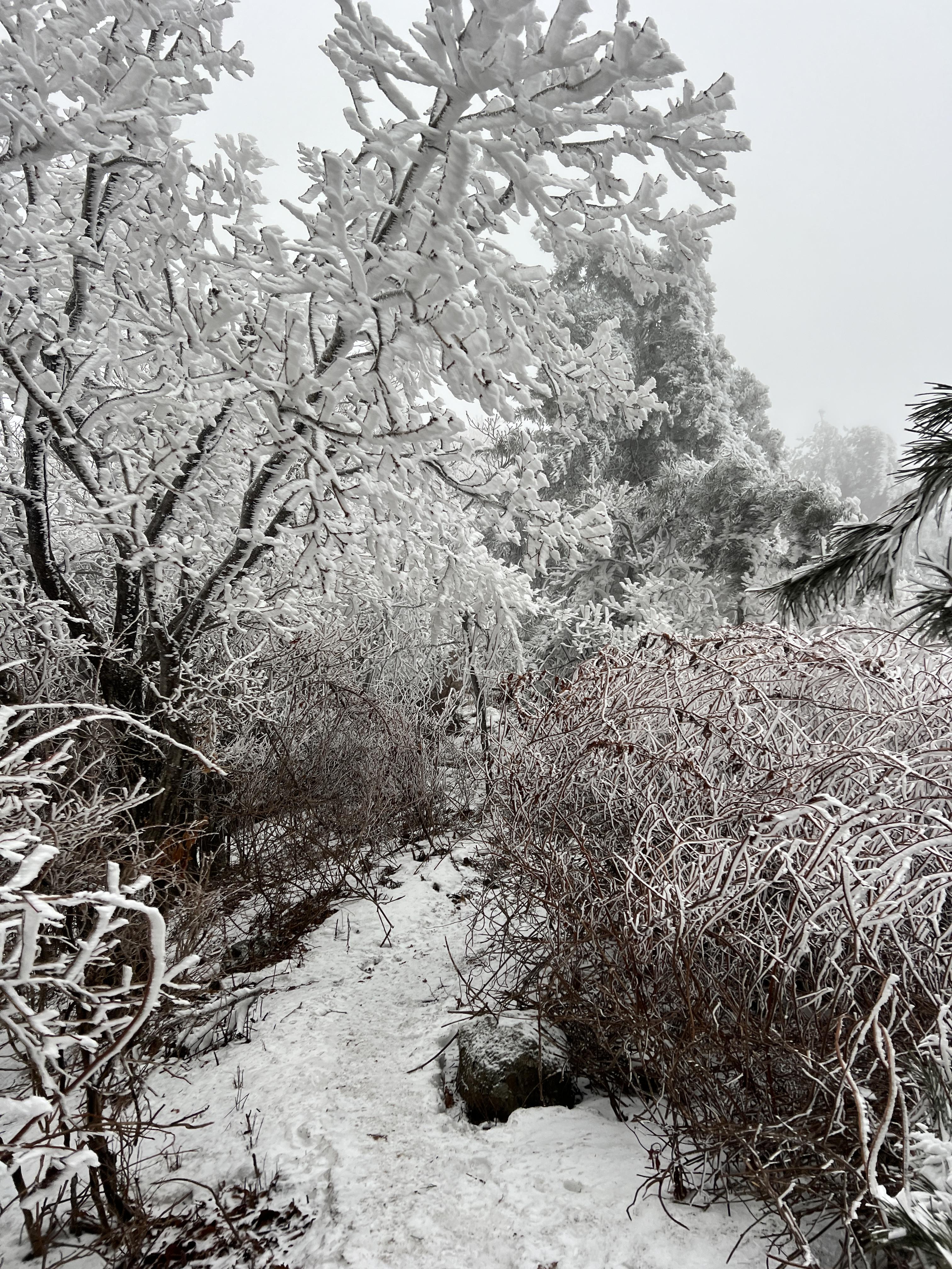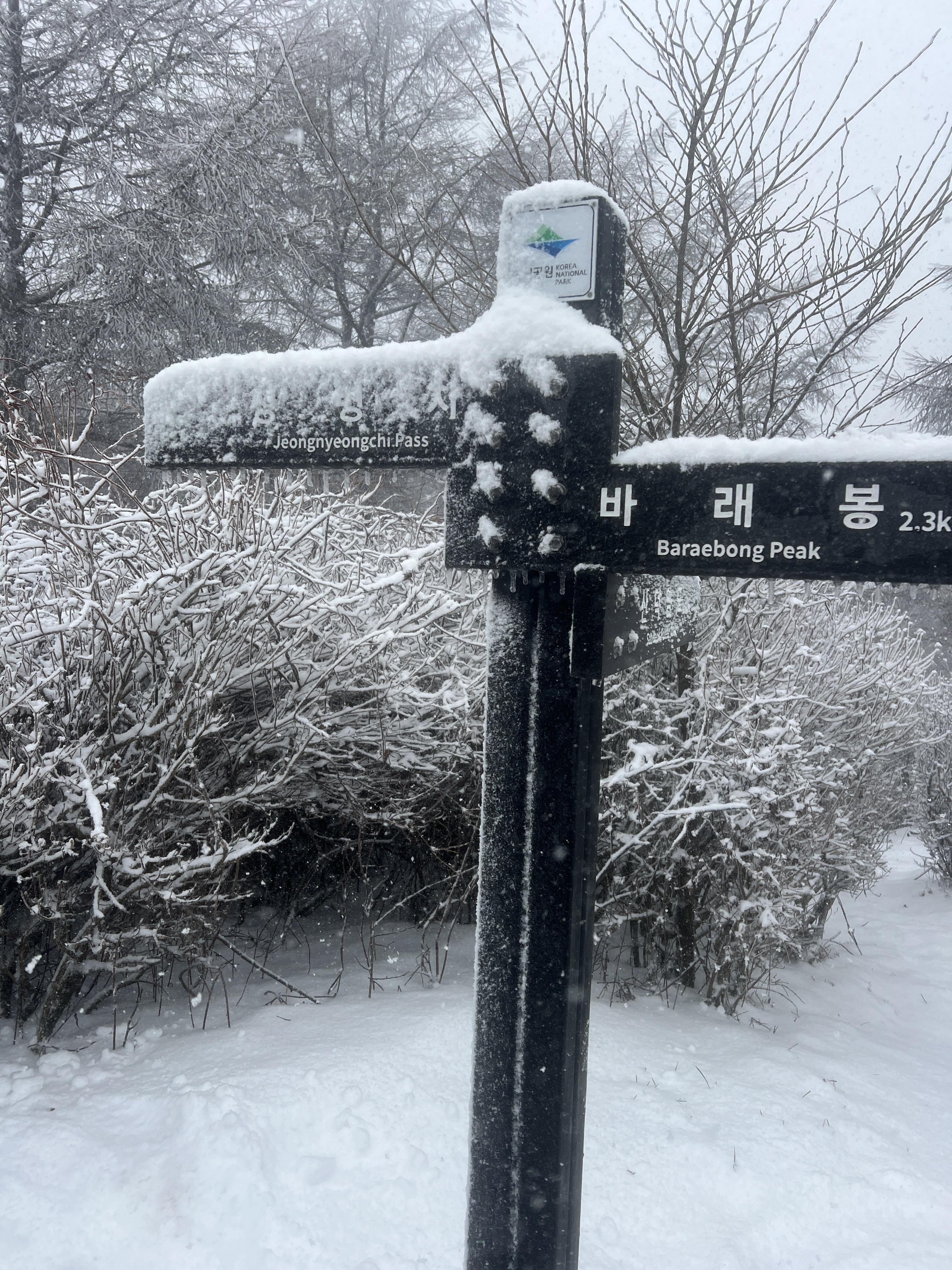 올라가면서 점점 눈밭으로 변해간다. 안개로 시야가 거의 없었지만 외길이라 찾아가는데는 문제가 딱히 없다. 다만 묘봉치까지 계속 오르막이라 체력 분배를 정말 잘해야한다.