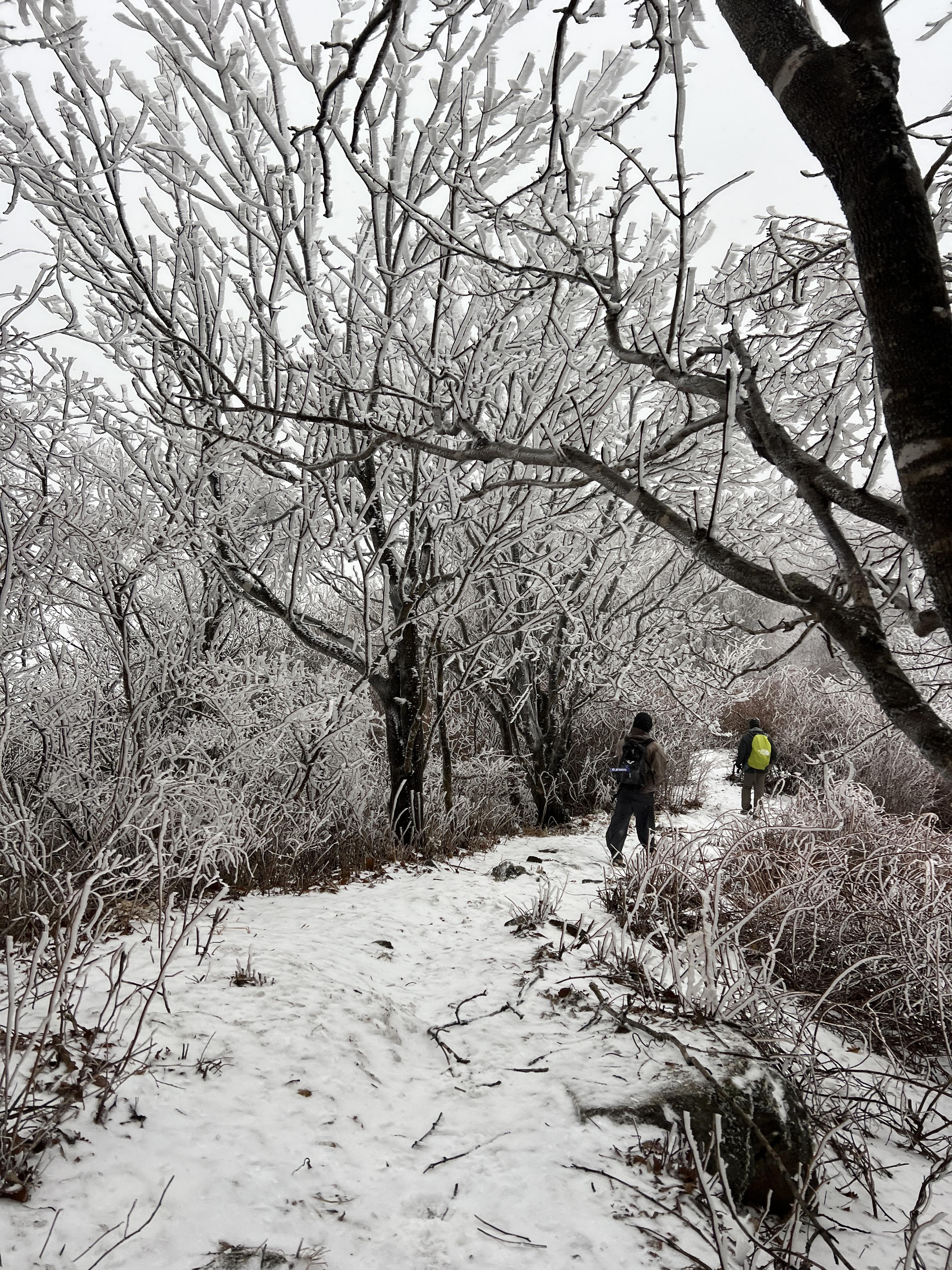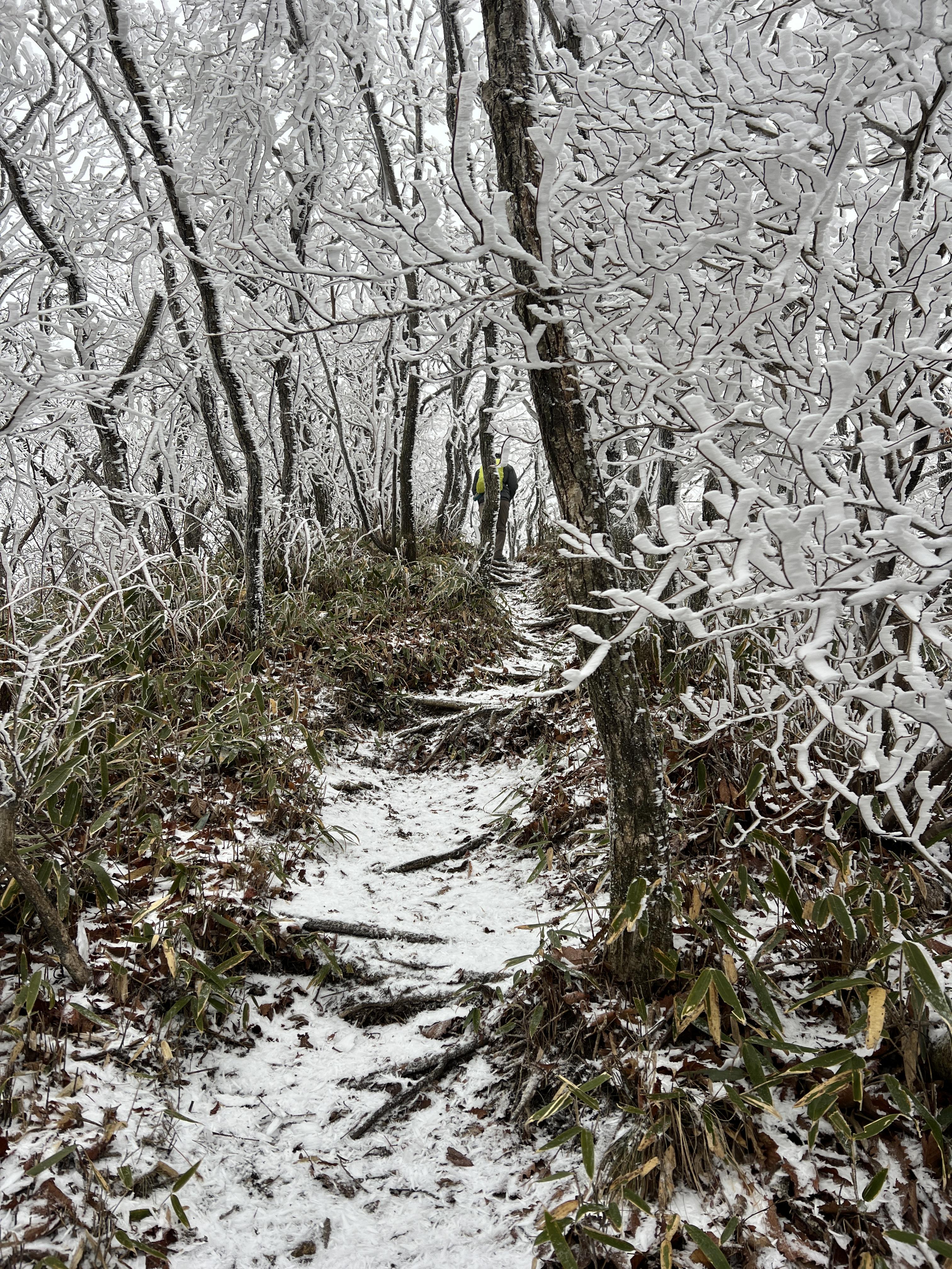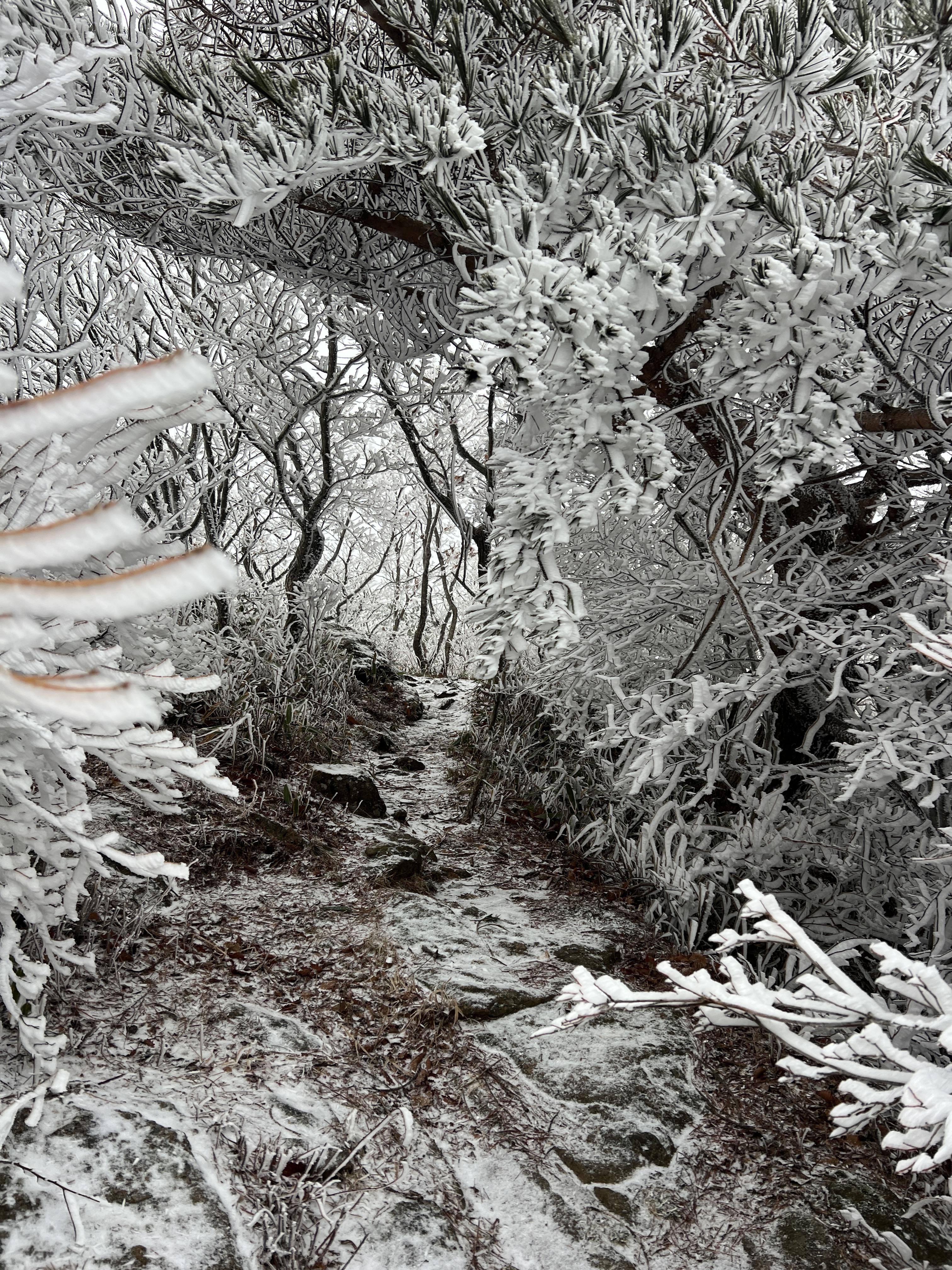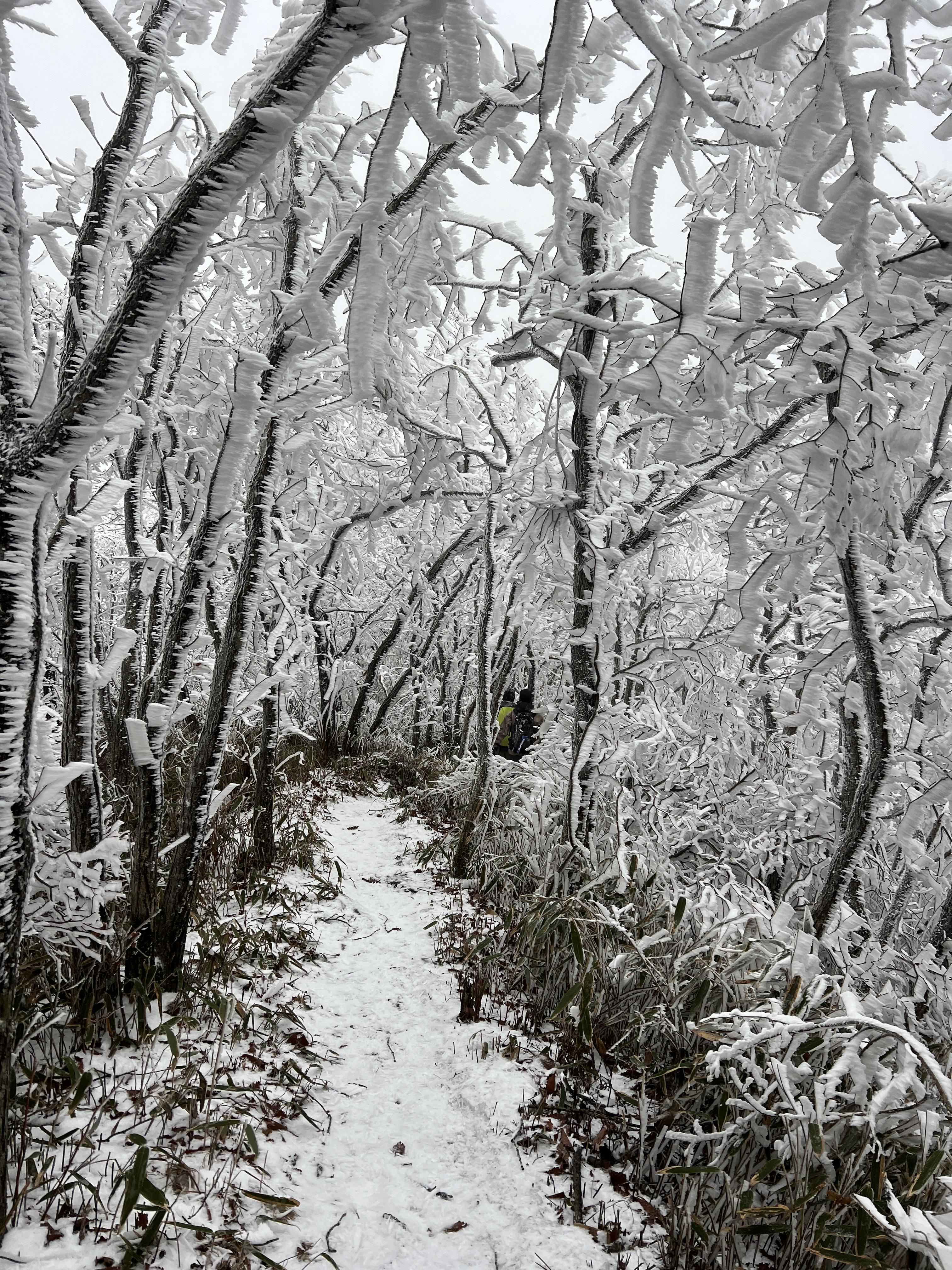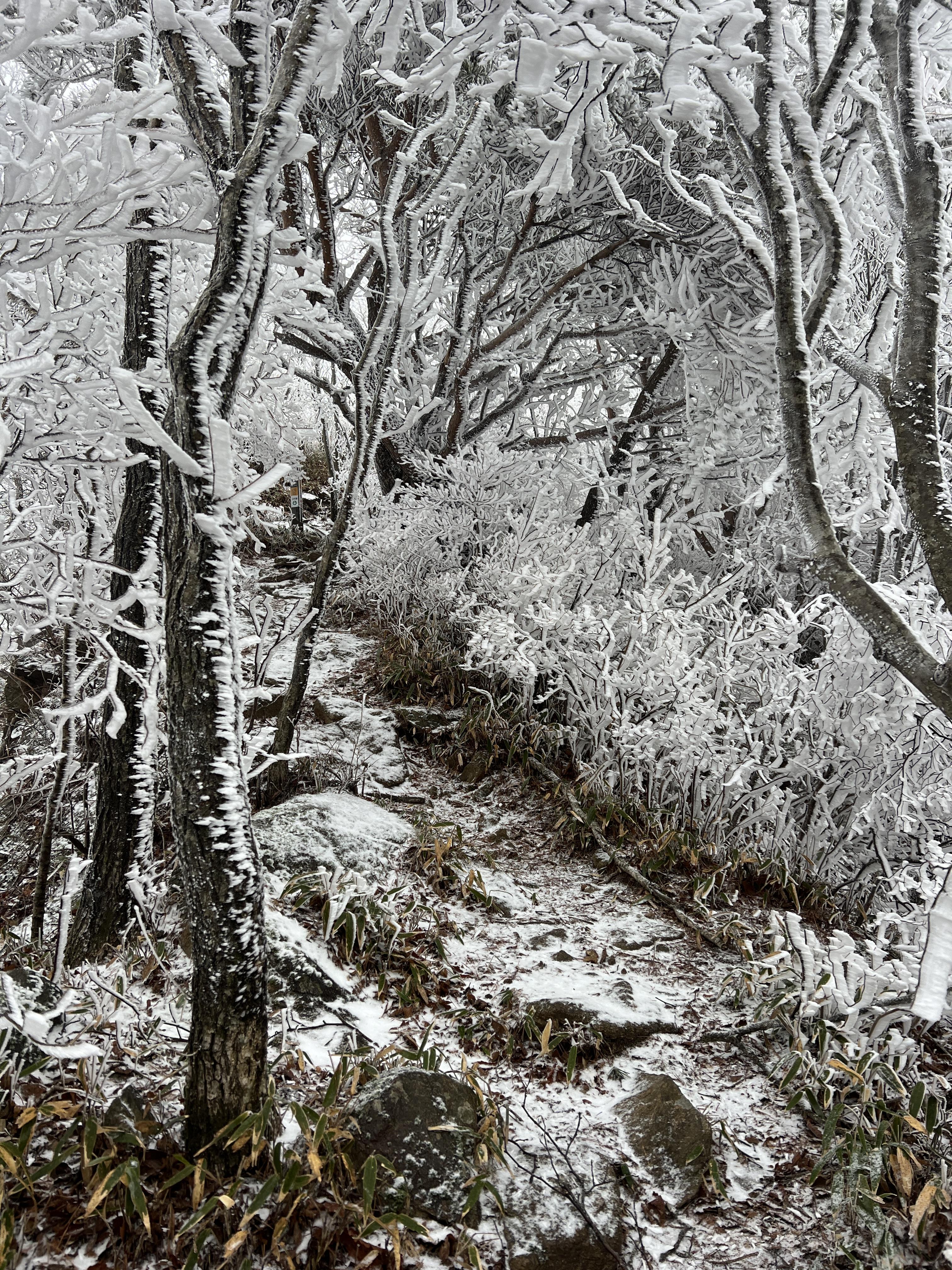 길은 설악산 서북능선과 다르게 돌길은 전혀없다. 대부분이 육산의 흙길이며 이는 바래봉까지 쭉이어진다. 날은 밝았지만 심한 곰탕으로 인해 뷰가 전혀 없어 아쉬웠다. 하지만 안개와 영하권의 추위가 만나서 두꺼운 상고대를 볼 수 있었다.