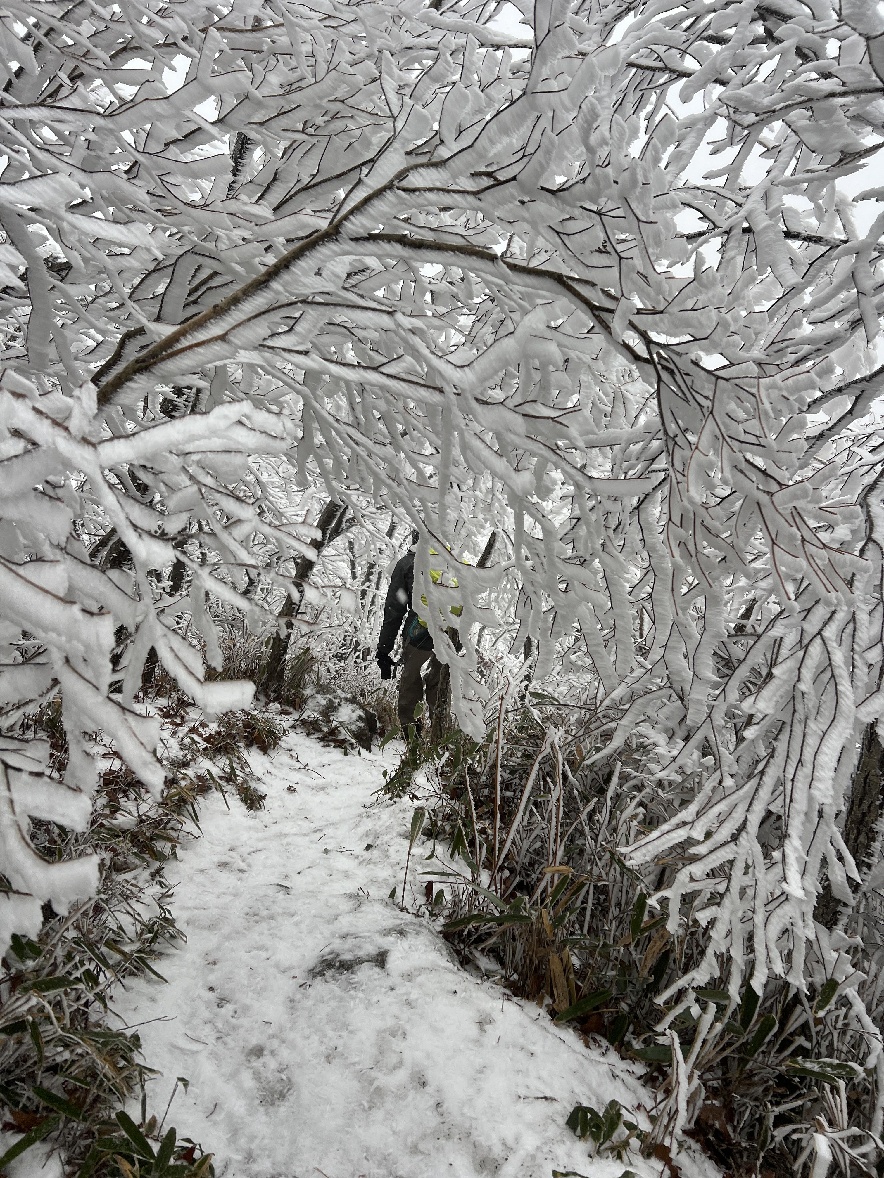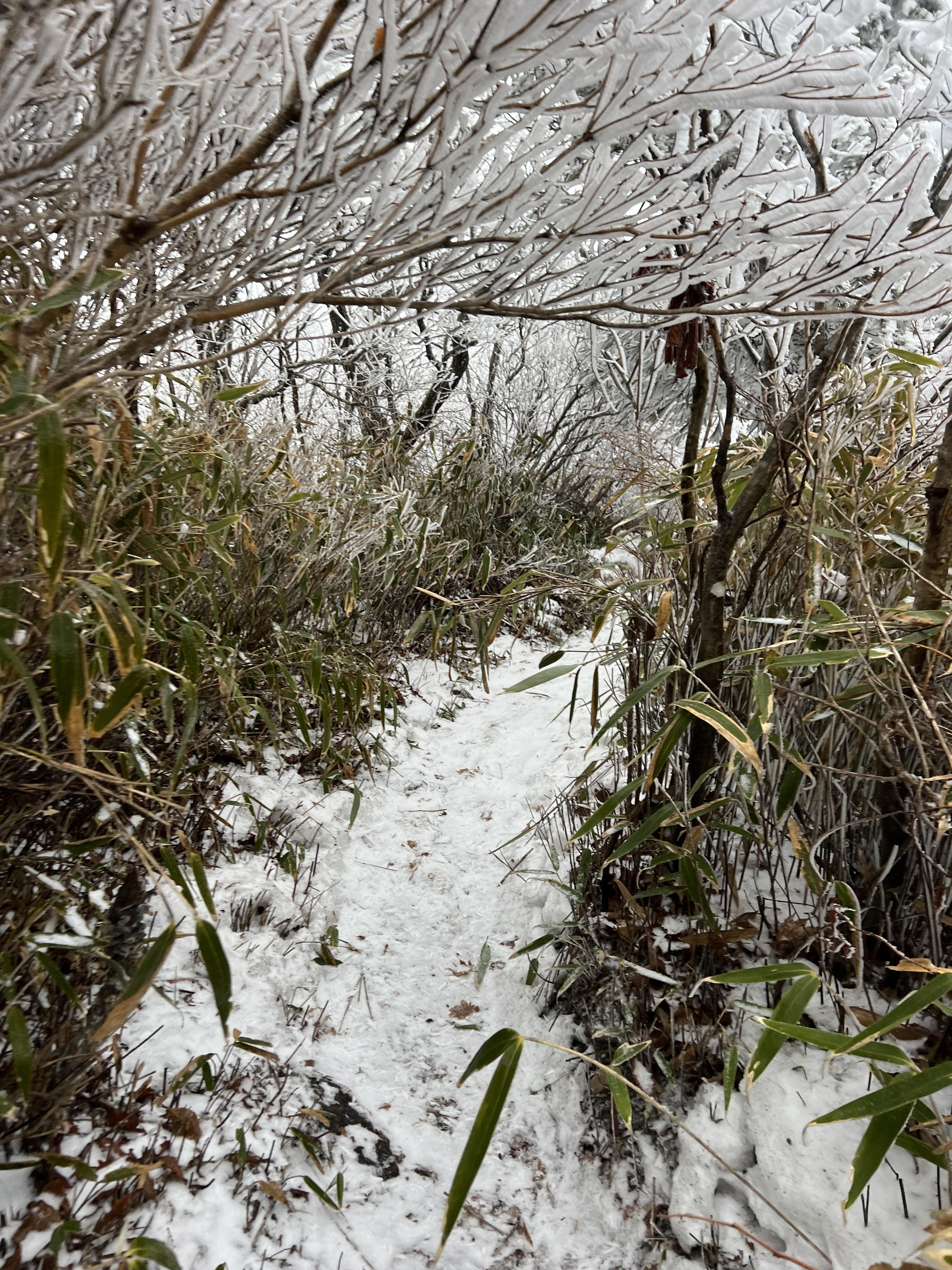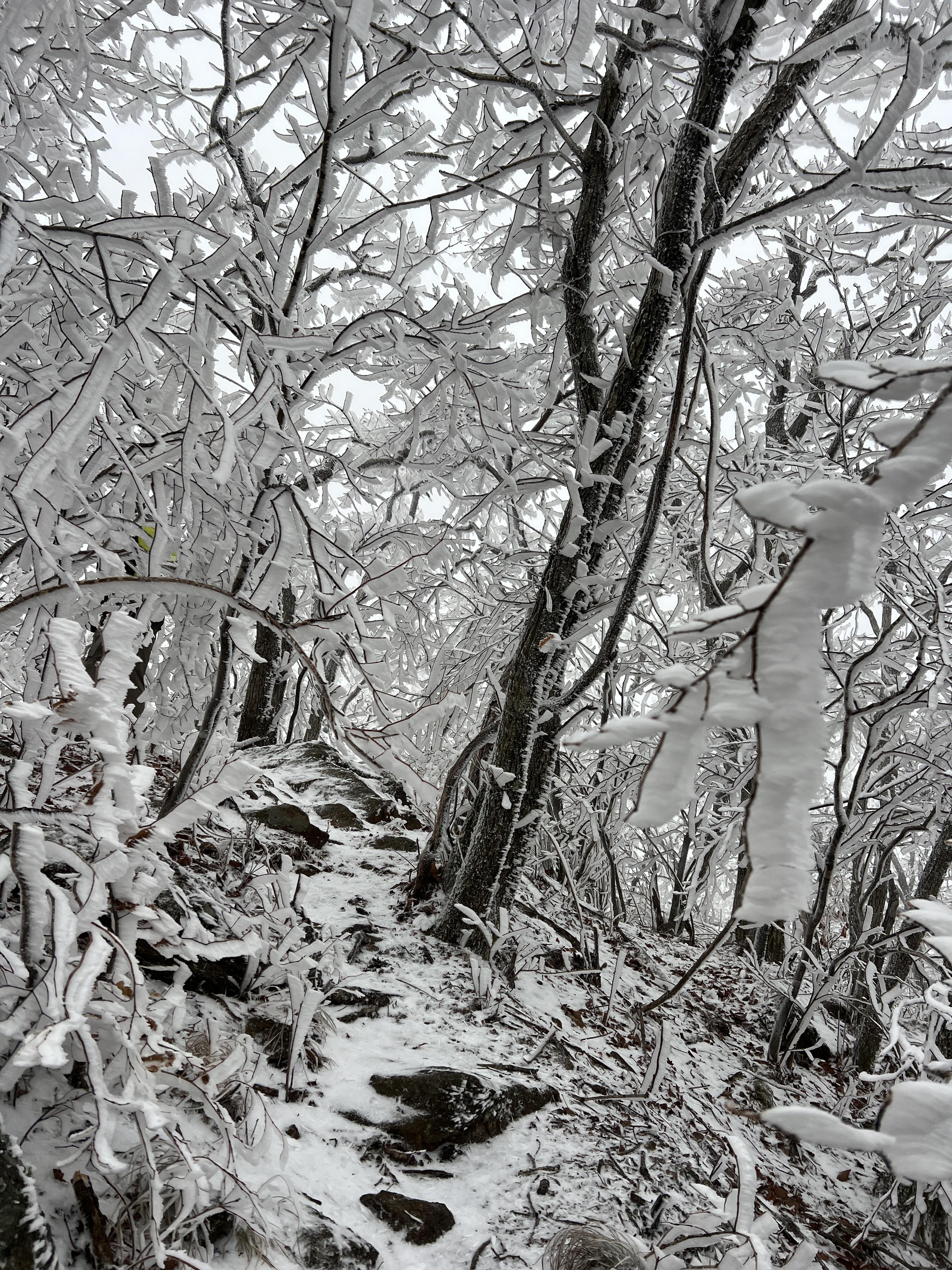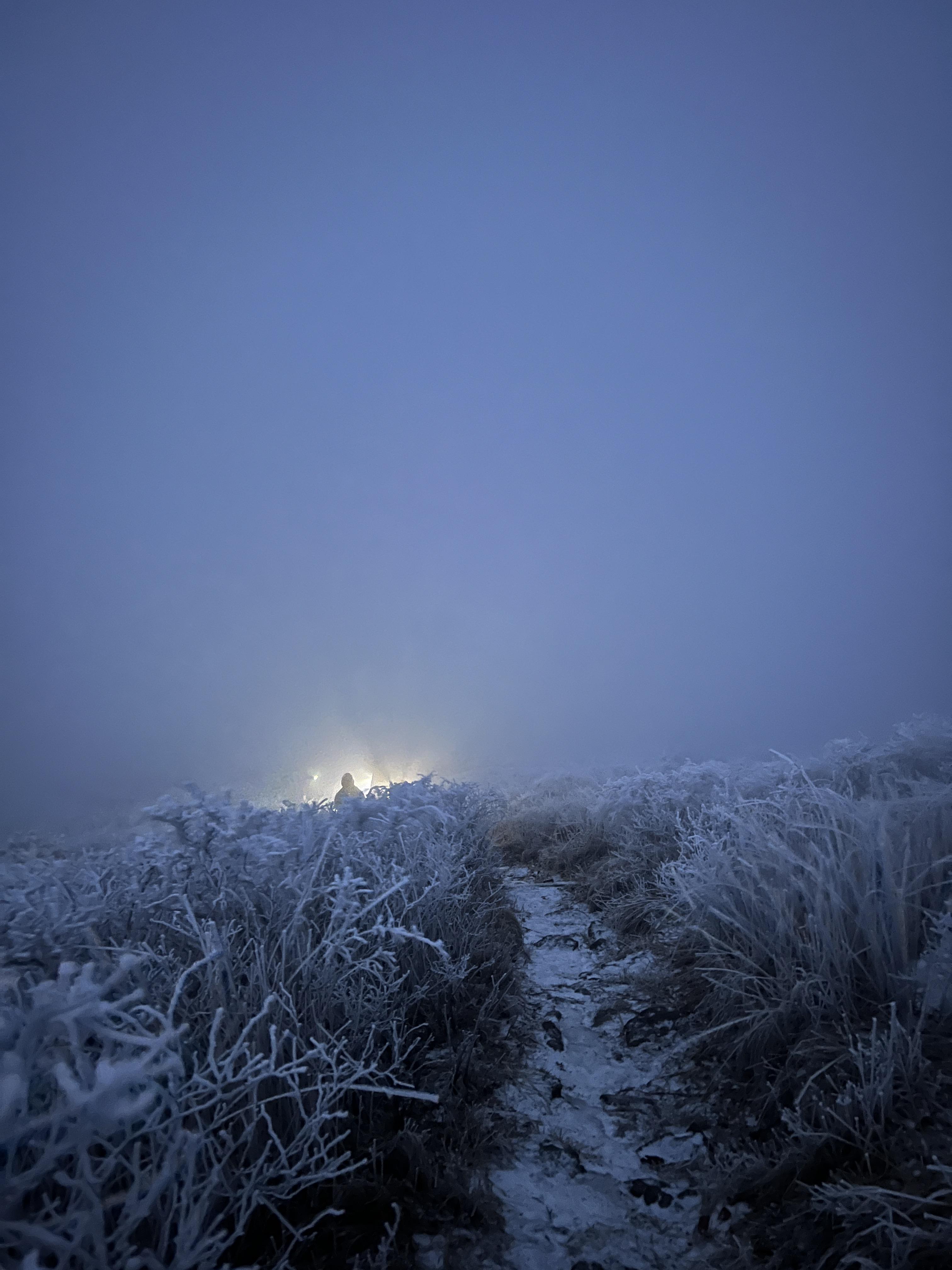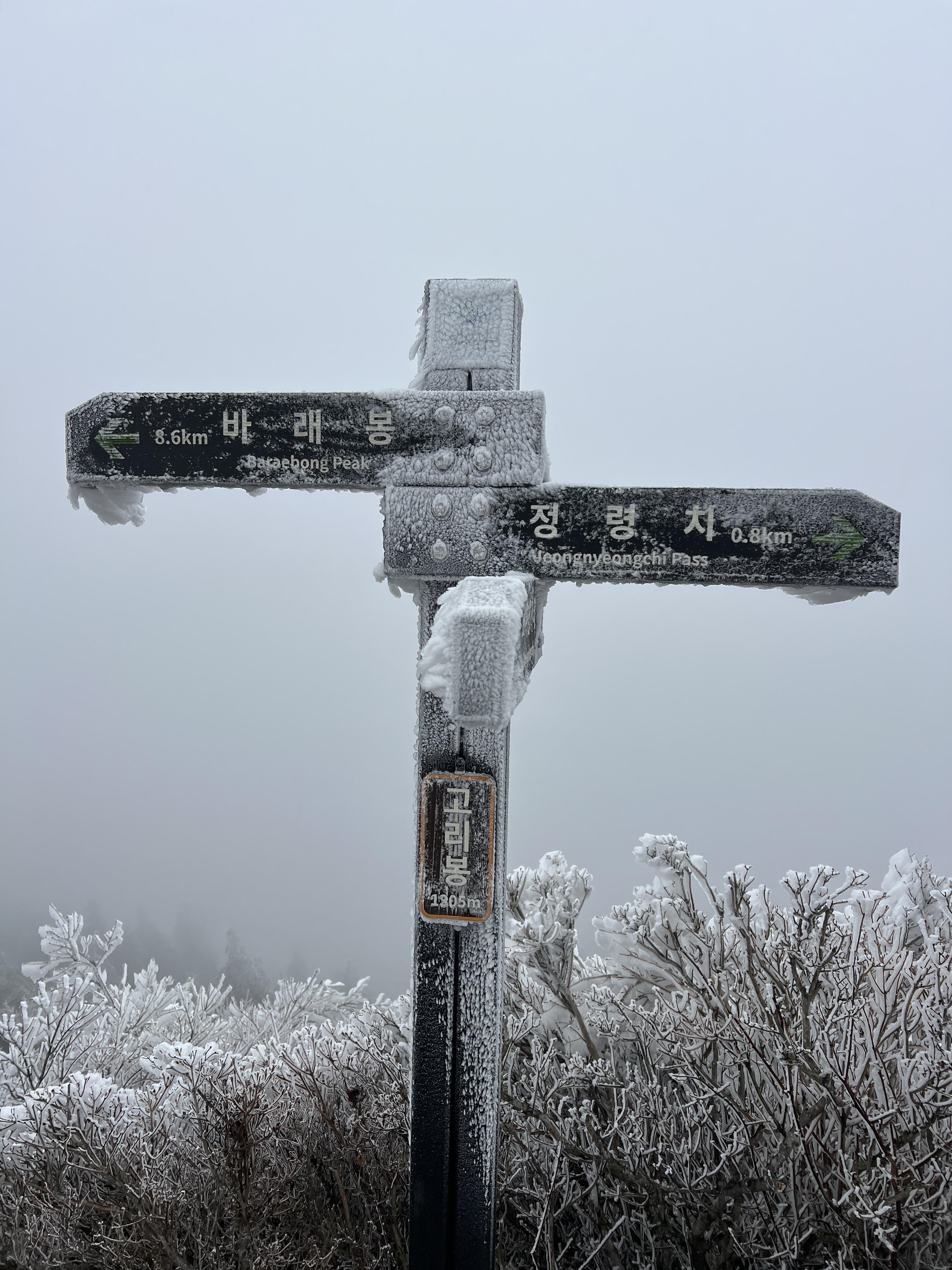 길은 설악산 서북능선과 다르게 돌길은 전혀없다. 대부분이 육산의 흙길이며 이는 바래봉까지 쭉이어진다. 날은 밝았지만 심한 곰탕으로 인해 뷰가 전혀 없어 아쉬웠다. 하지만 안개와 영하권의 추위가 만나서 두꺼운 상고대를 볼 수 있었다.