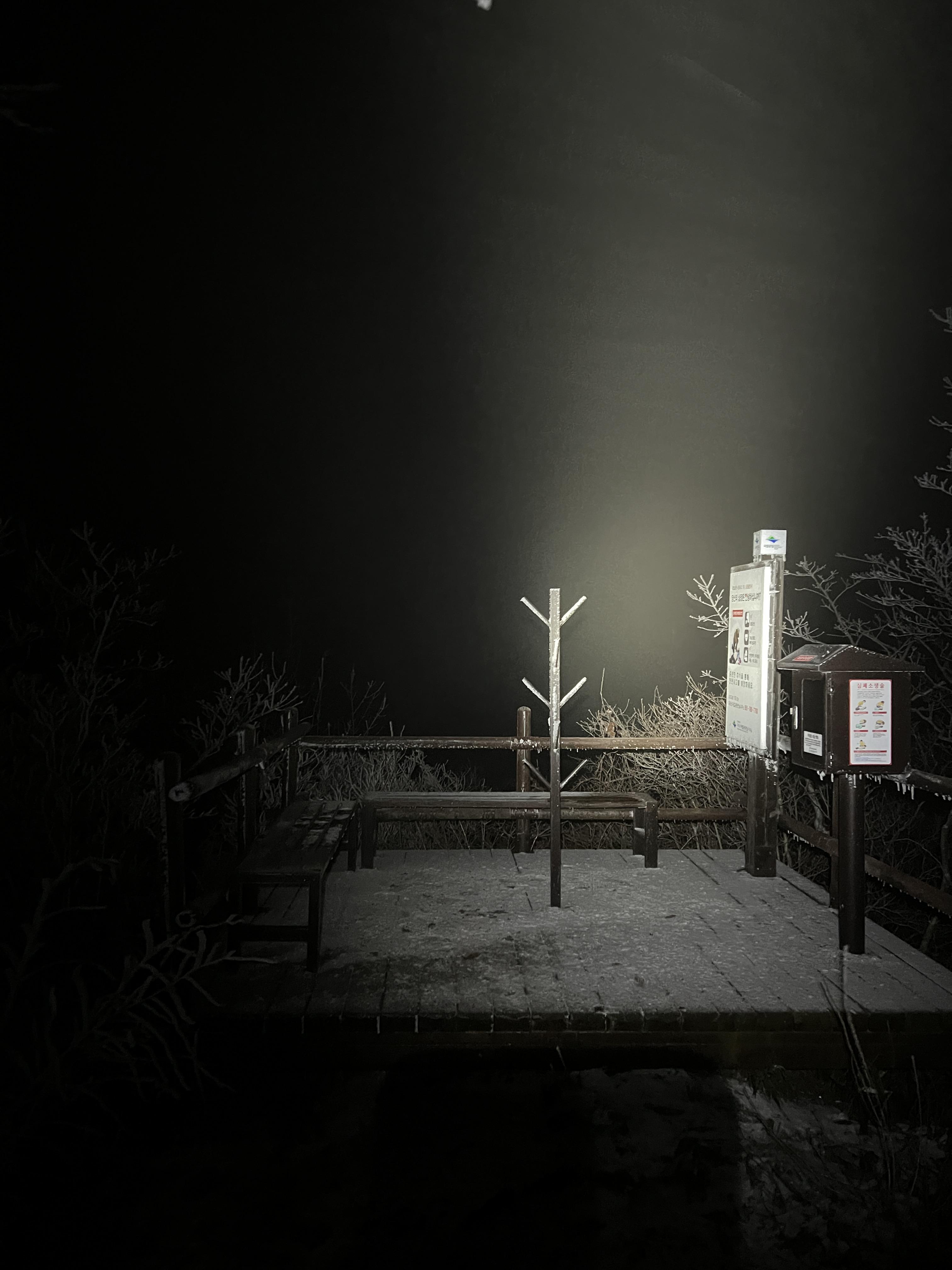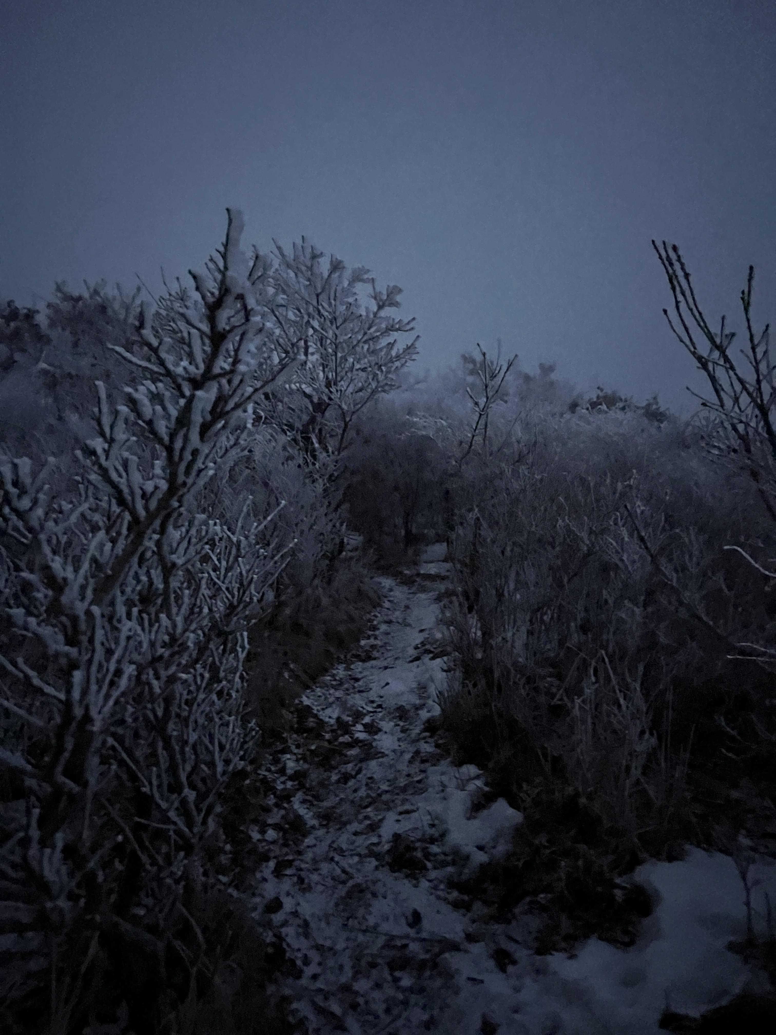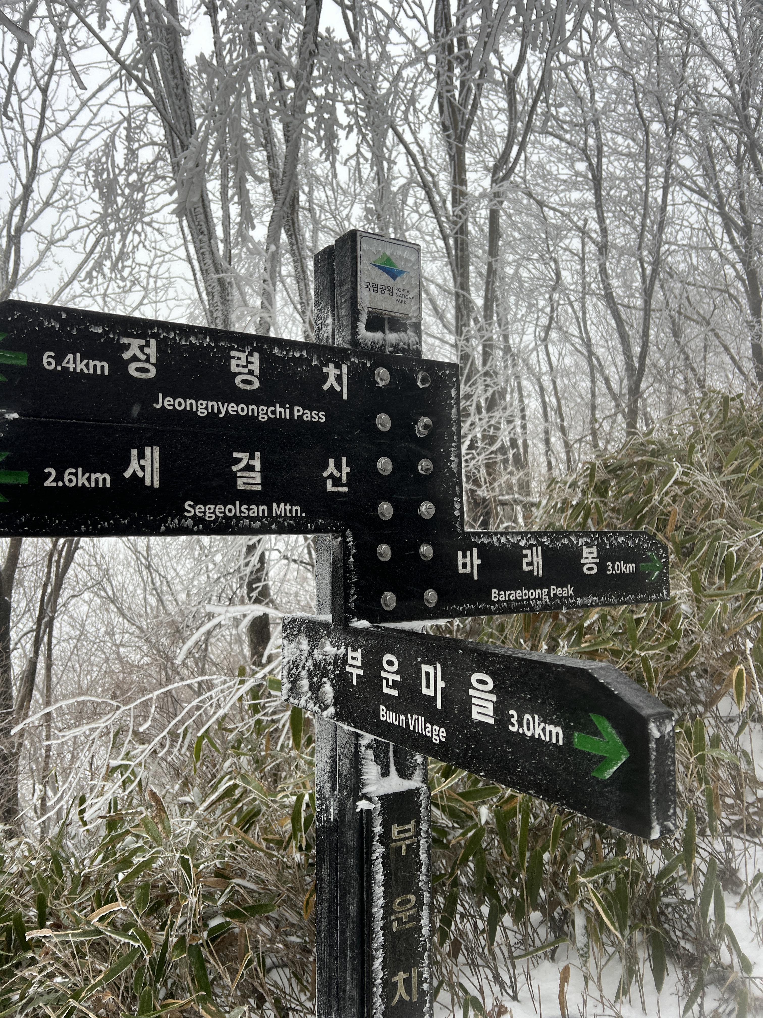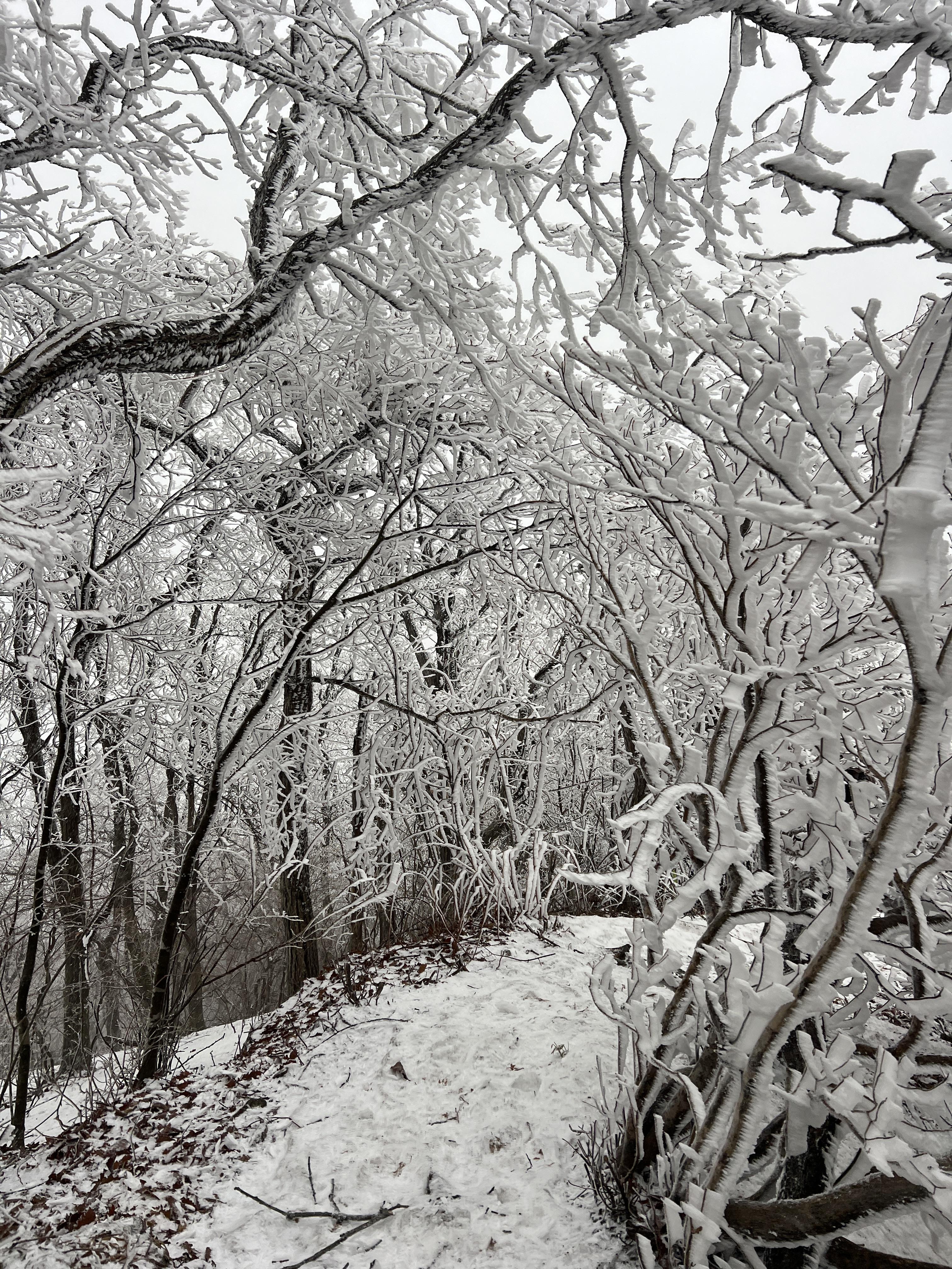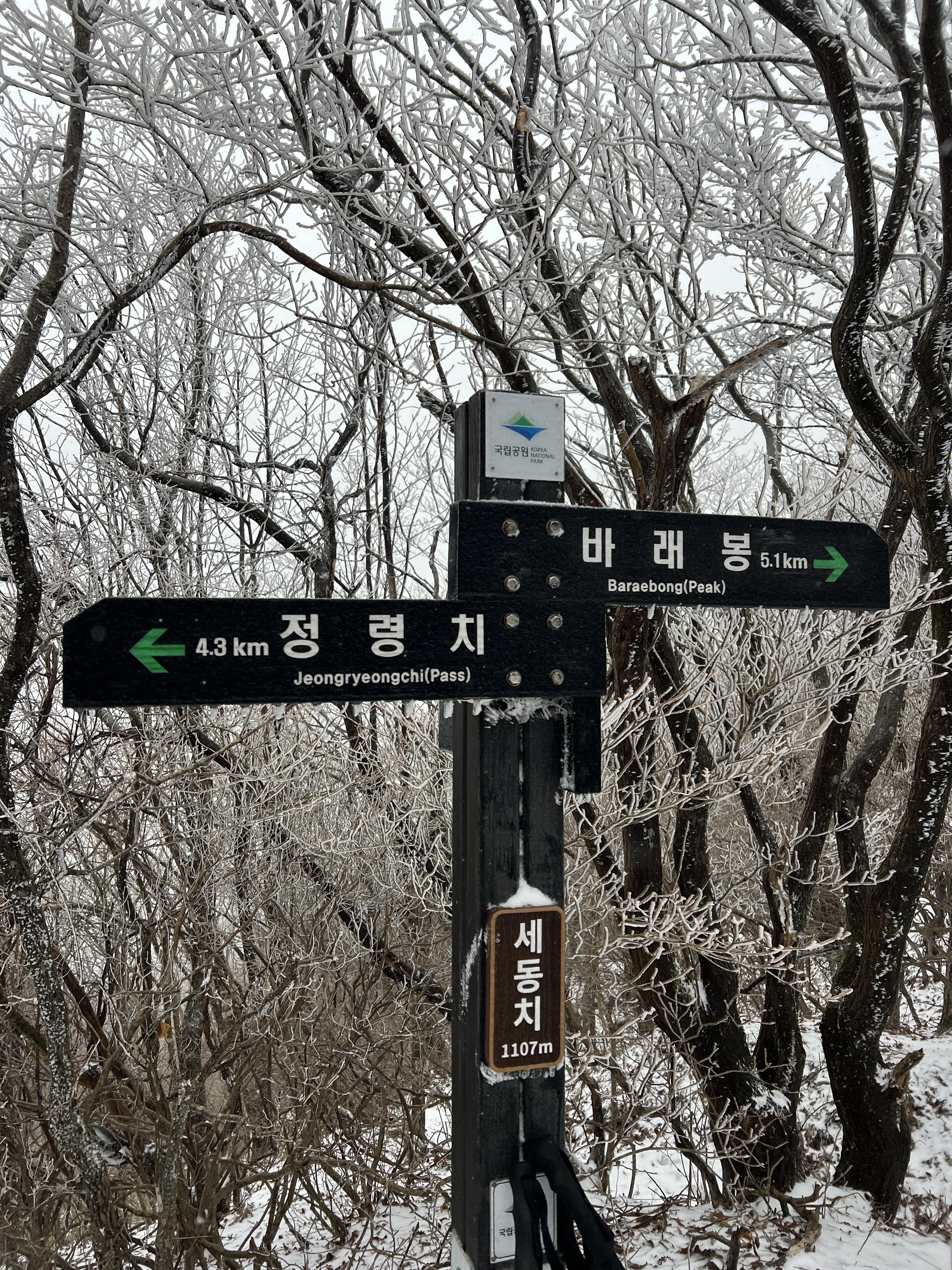 길은 설악산 서북능선과 다르게 돌길은 전혀없다. 대부분이 육산의 흙길이며 이는 바래봉까지 쭉이어진다. 날은 밝았지만 심한 곰탕으로 인해 뷰가 전혀 없어 아쉬웠다. 하지만 안개와 영하권의 추위가 만나서 두꺼운 상고대를 볼 수 있었다.