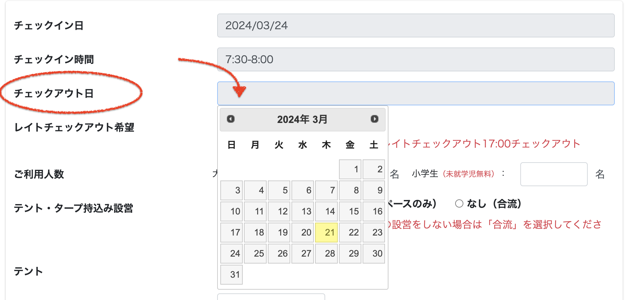 빨강색 동그라미 부분이 체크아웃날짜를 의미하며 비활성화 같지만 빨강색 화살표를 클릭하면 체크아웃을 선택할 수 있는 달력이 나온다. 여기서 체크아웃을 반드시 설정해줘야한다.