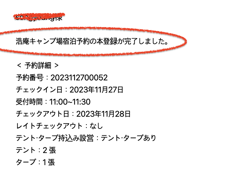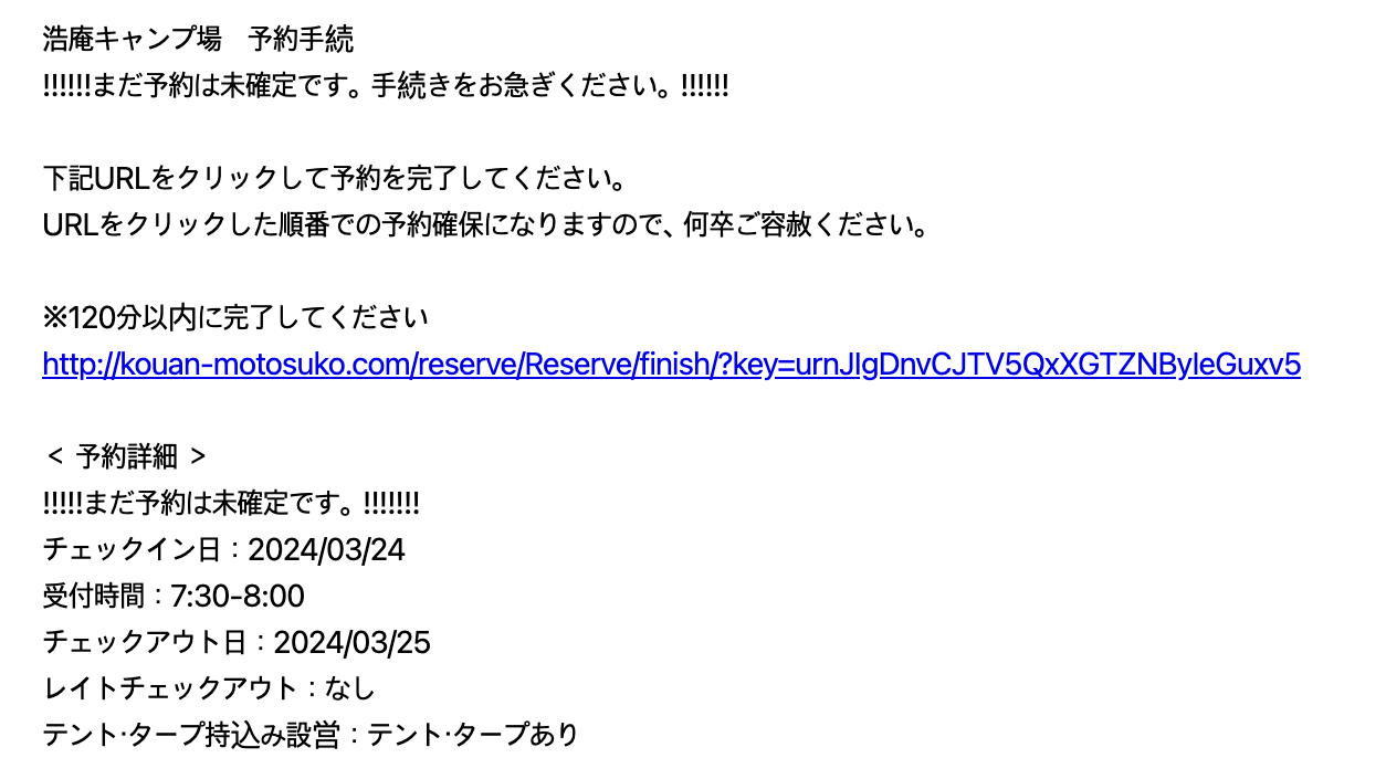 위와 같은 메일이 날라오는데, 여기서 120분 안에 위 링크를 클릭해야한다. 클릭하지 않으면 자동으로 취소되며, 반드시 클릭해줘야한다. 특히 인원, 차량, 텐트,타프 갯수는 체크인할때 변경이 가능하니 시간만 잘 확인 후 클릭하도록 한다.