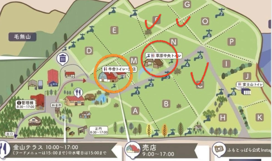 빨강색 동그라미가 화장실인데, 여기는 화장실과 오직 개수대만 있다. 또 사이트는 개인적으로 빨강색 체크 표시한곳이 가장 좋은것 같다. 완전한 평지에, 후모톳바라를 가장 적당한 거리에서 볼 수 있다. 물론 이것은 개인적인 취향이니 참고 바란다.