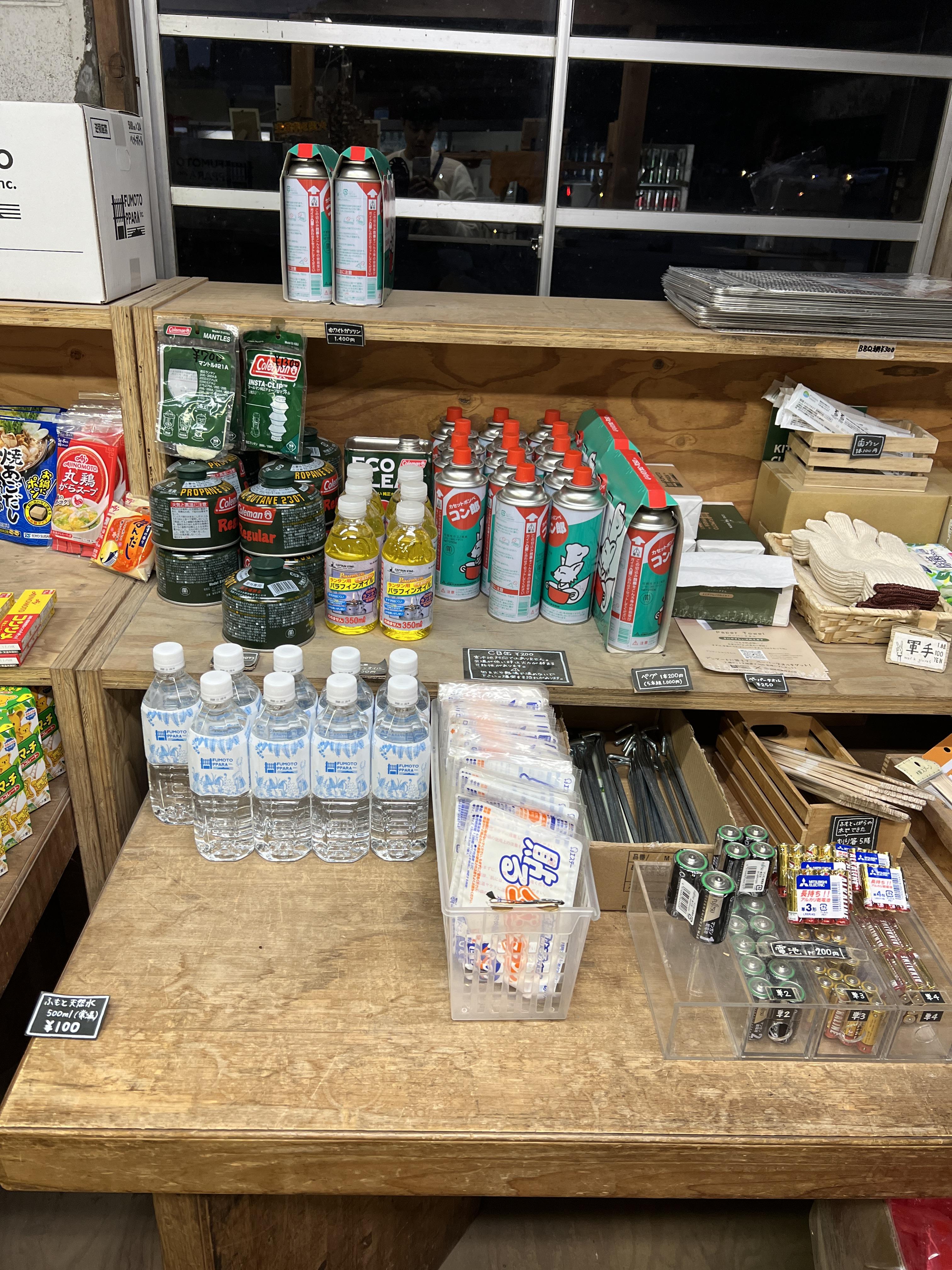 매점(주황색 동그라미) 에서 판매하는 물품들이며 기본적으로 물, 건전지, 이소가스, 부탄가스, 후모톳바라 푸딩과 삼겹살을 판매한다. 하지만 삼겹살은 늦은 시간이어서 그런지 이미 매진. 삼겹살은 인기가 많으니 이른시간에 방문하여 꼭 먹어보는 것을 추천한다. 아직 저도 못먹어봄...