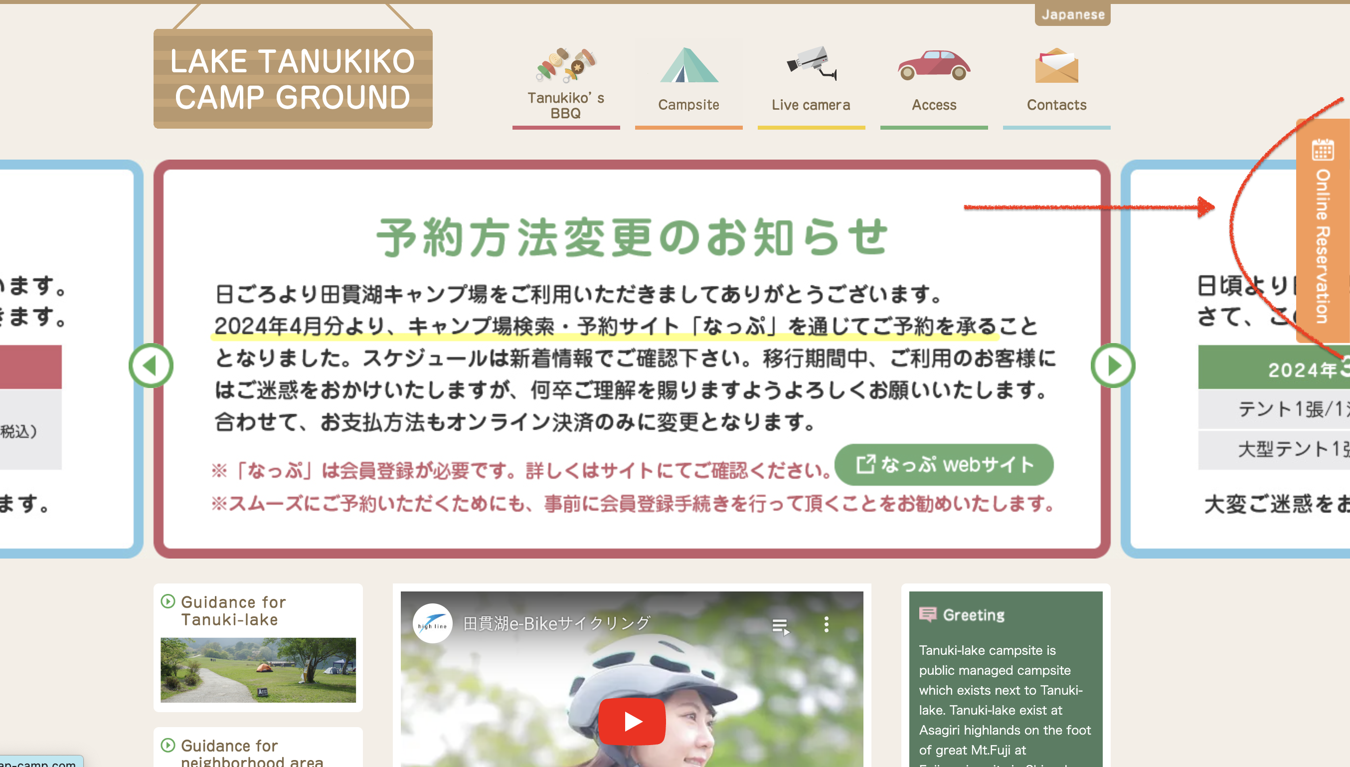 타누키 호수 캠핑장 예약 사이트이다.